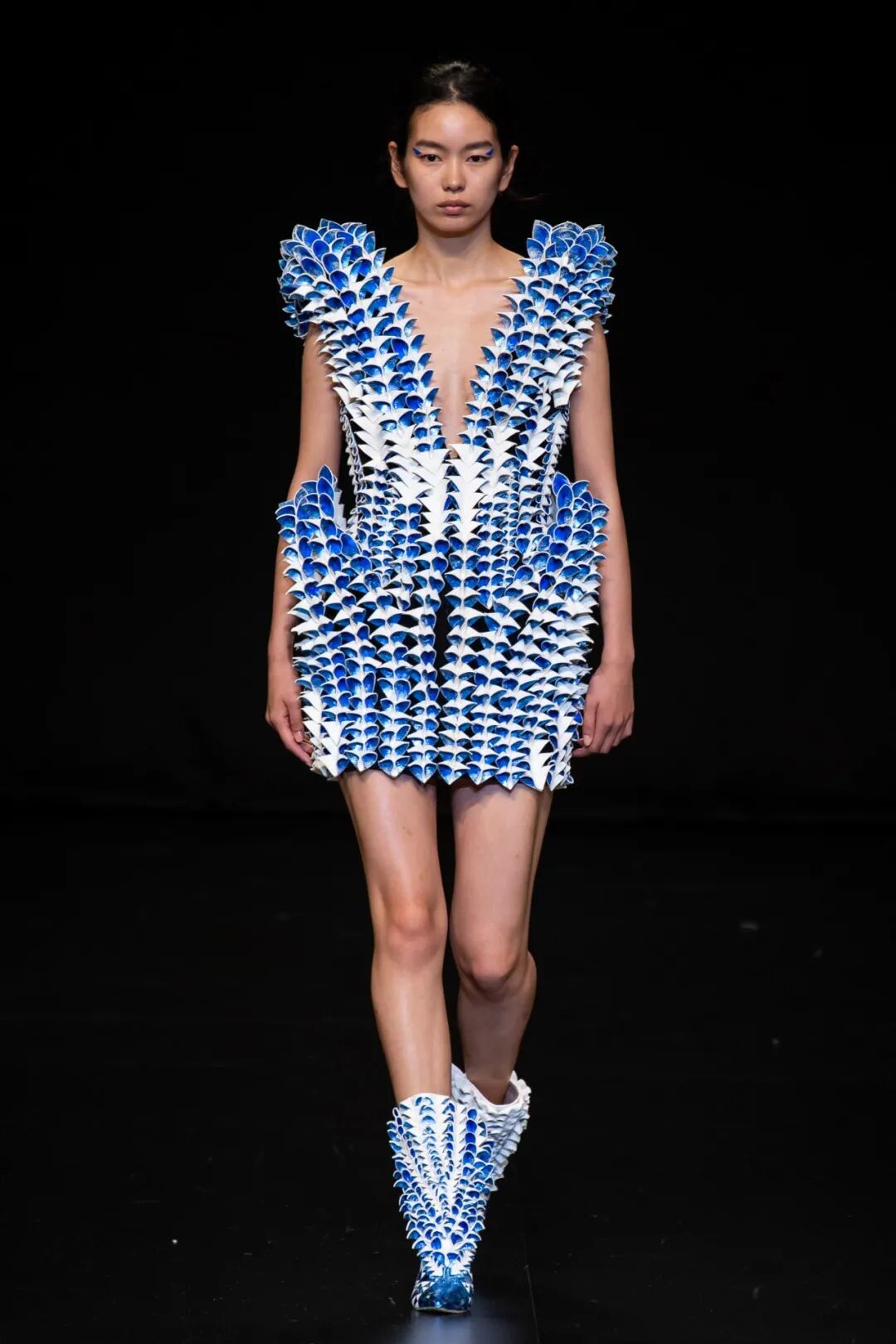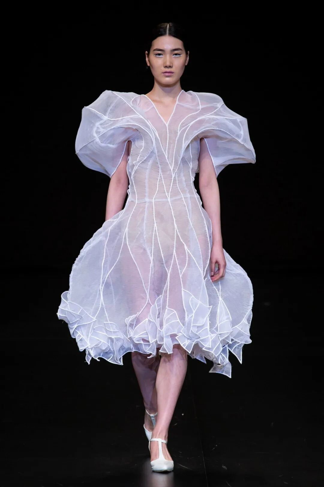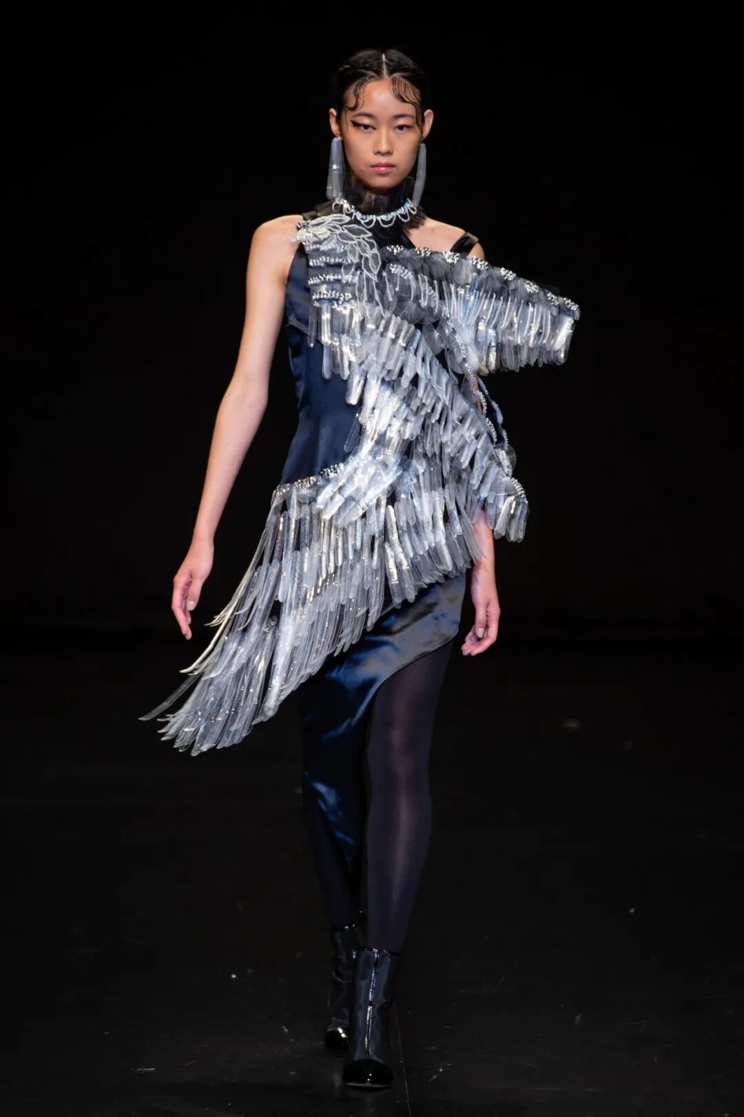 在这一系列参赛作品中,设计师用到了约3000个钉子代替了传统缝制方式,并将钉子制作出盲文版本的亨利·斯科特·霍兰德的诗歌《Death is nothing at all》,最终融入衣服当中,这是一部盲人也能享受的作品。