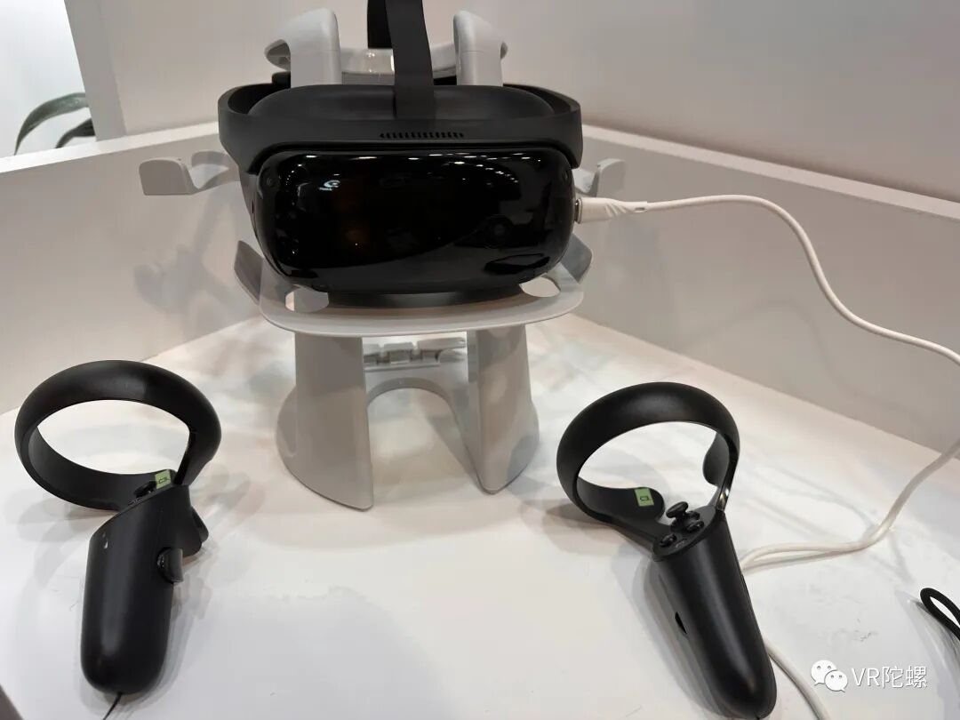 该设备采用Pancake光学,重量约400g。头显部分比较轻薄,厚度约3cm左右。头显分辨率为双眼5K,采用视涯的Micro-OLED屏幕,头显内置高通骁龙XR2芯片,支持眼动追踪、手势识别,并且支持IPD和0-700度屈光度调节。头显RAM为8GB,ROM为256GB。头显支持inside-out空间定位,以及Video See Through,头显上共有6颗摄像头,4颗摄像头用于Slam定位,2颗摄像头用于VST。