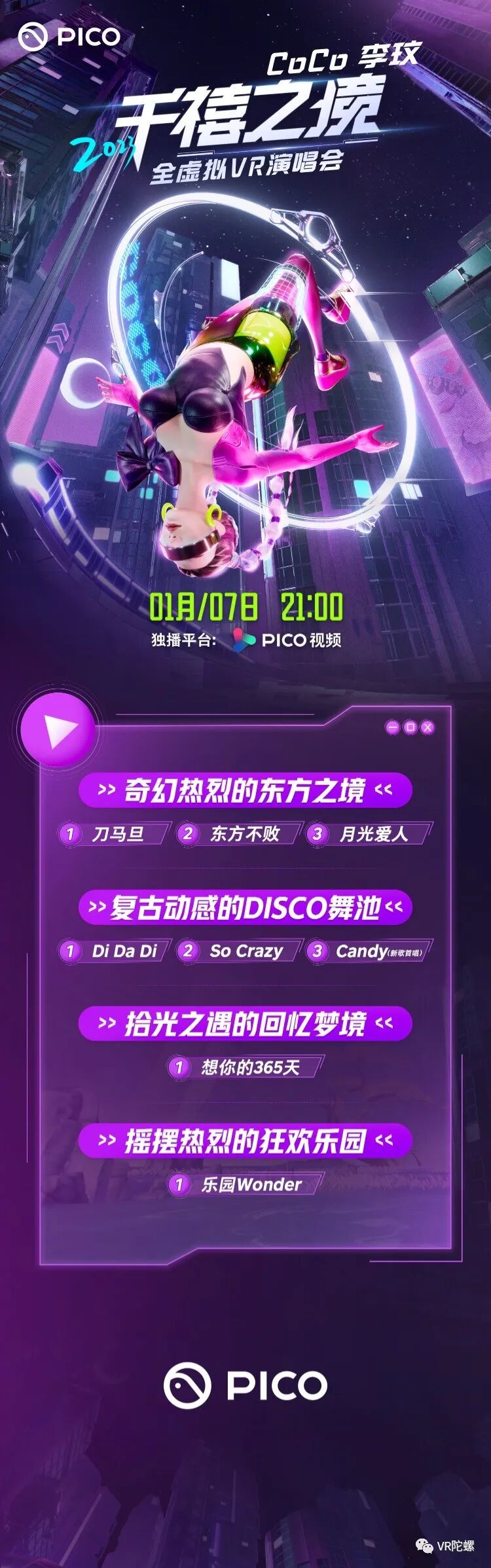该演唱会将于 1 月 7 日晚上 9 点正式登陆 PICO 视频,具体歌单可参考下方官方海报图: