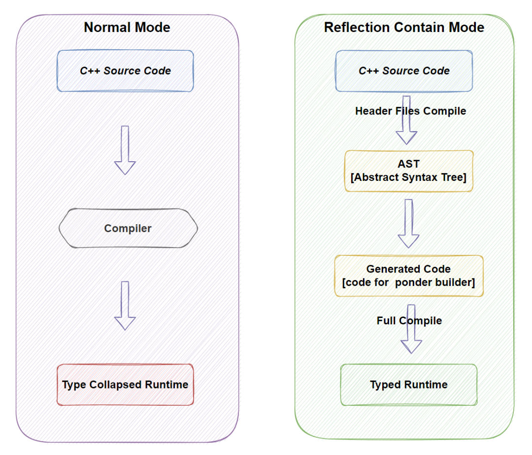 回到反射信息生成上,我们直接工作在libclang这一层就足够了,原因是AST本身有足够多的相关信息,我们能够提取到足够的类型和组成信息来组织最终的注册代码。我们先来看一下普通模式下的编译方式和带反射信息下的编译方式: