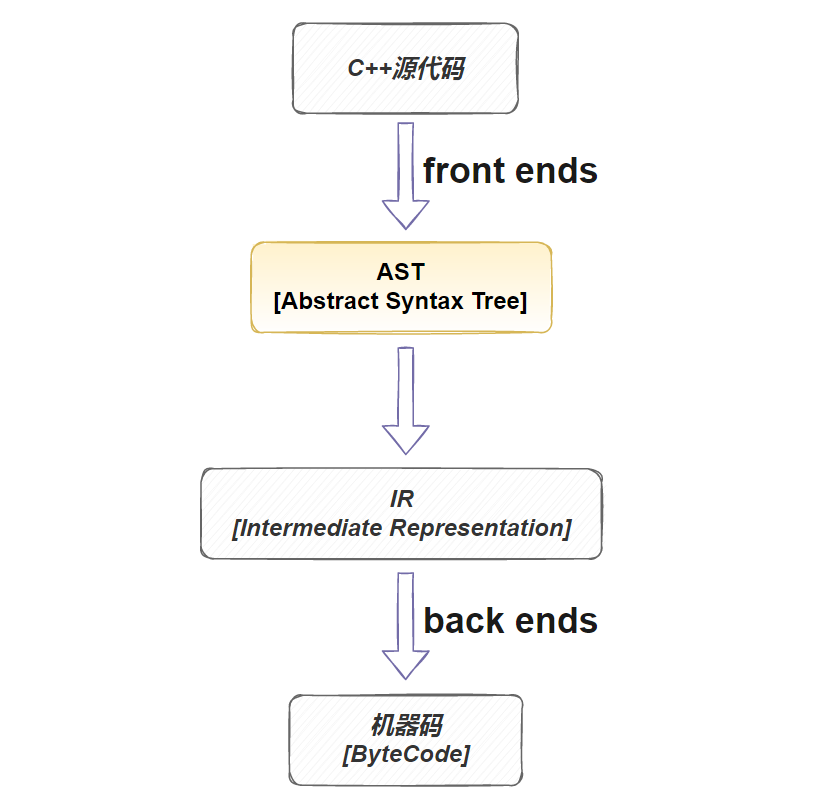 早期没有llvm库的时候,我们只能通过正则匹配等字符串模式匹配的方式来完成相关工作,这种方式比较大的弊端一方面是效率,另外一方面是业务程序对代码的组织方式可能破坏自动工具的工作,排查和定位相关问题又不是那么直接。在llvm库流程后,越来越多的人开始尝试在AST这一层对源代码信息进行提取,这样相关的问题就回归到了c++本身来解决了,这肯定比前面说的基于字符串的机制要稳定可控非常多,相关的问题也更容易定位排查。要使用这种方式,我们先来简单的了解一下libclang。