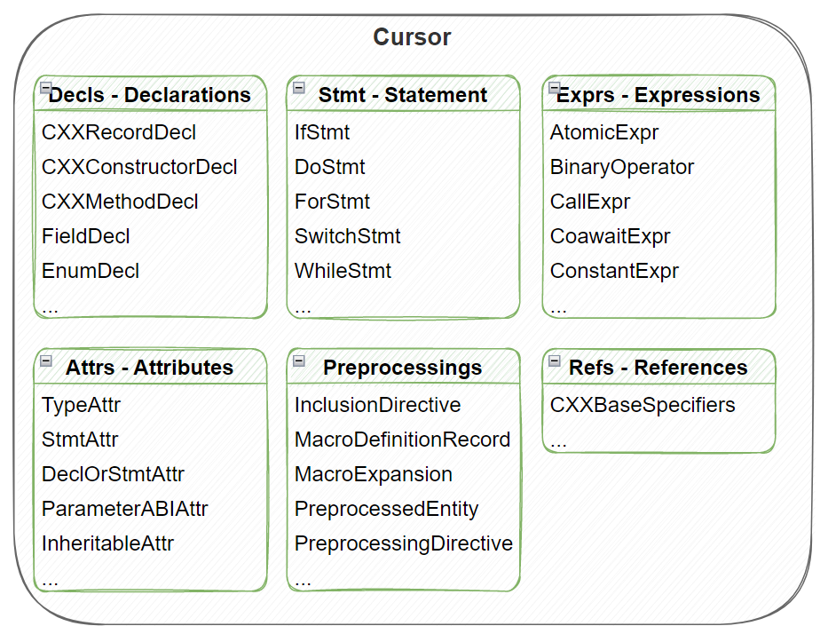 复杂度较高的Cursor主要还是集中在Stmt和Exprs部分。但因为跟源代码语法基本是一一对应的关系,上手难度并不高。