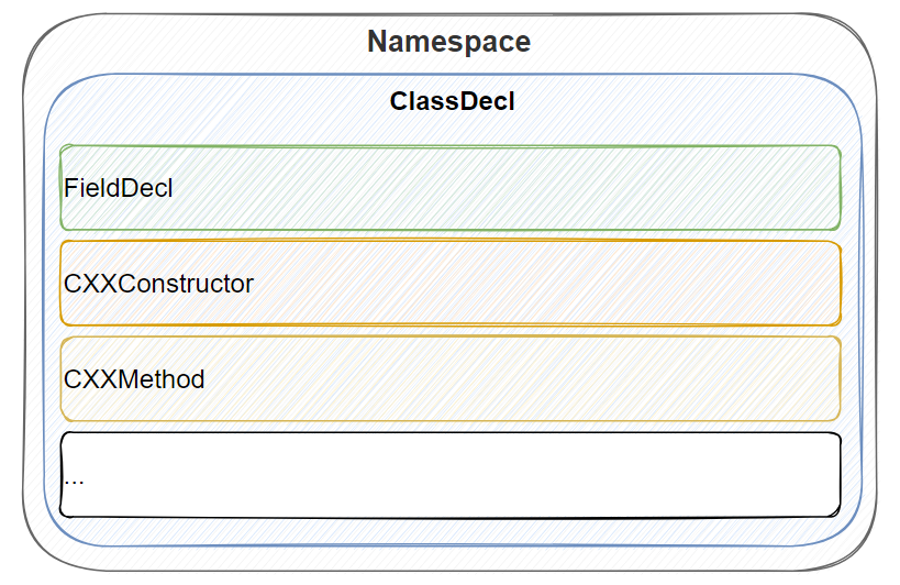 前面我们介绍了c++ AST的基本表达,对于HighLevel的ClangSharp来说,某个namespace下的类的定义,其结构如下: