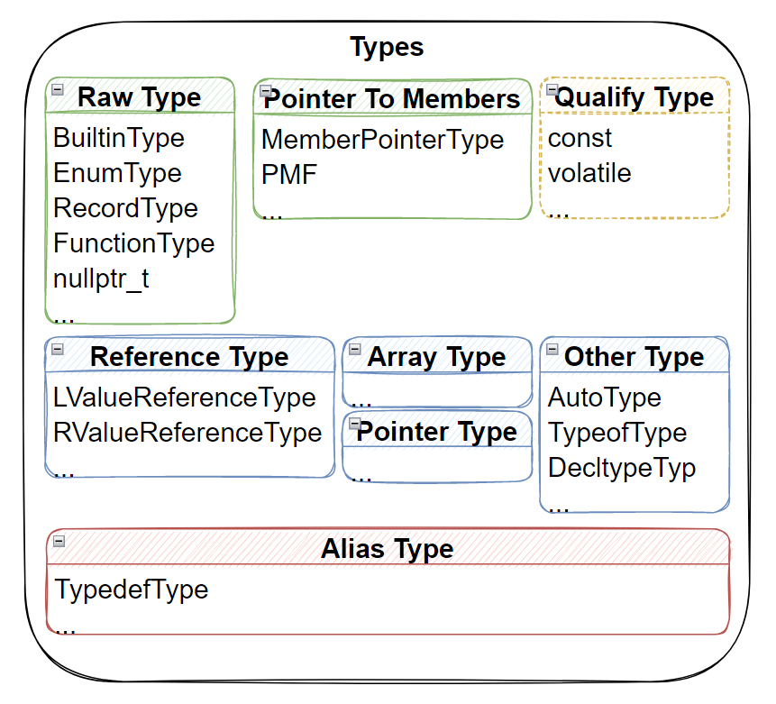 c++复杂的类型系统始终是离线工具处理的一大难点,如下图所示,我们给出了c++中大概的类型分类: