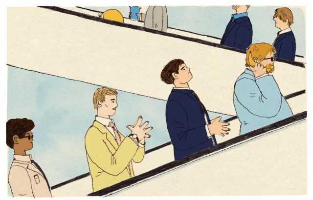 我也看电影寻找灵感。例如,Yasujirō Ozu 的作品就因为层次分明的场景而留在我的脑海中,我在构建环境时会尽量记住他的作品。在 Aki Kaurismäki 的电影《勒阿弗尔》中是一堵非常蓝的墙,自从我看了之后就一直没有离开过我的脑海。我试图复制它,但还没有成功。有时,我在电影中看到一个红色的烤面包机或其他东西,我就爱上了它。所以在我的下一个任务中,我会把它偷运到某个地方。但我也经常观察周围的环境。我认为在平凡的事物中发现美是有帮助的,因为这样你就可以在工作中使用它。就在最近,我在创作一个作品,我觉得为了让这个想法奏效,这个人必须穿过非常高的草丛,但这个形象在我的脑海里感觉很无聊。所以我会研究了生长在草地上的不同植物,并尝试使用各种元素——试图找到直线、圆形、小元素、大元素和空白空间的良好组合。在一天中,我发现自己看着路边生长的小植物,并在脑海中做笔记。