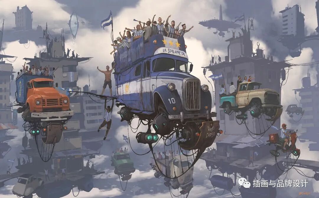除了飞行交通工具,在您的画作中您可以清楚地看到,未来将会有一场非常大的战争,将我们真正引向世界末日。请说说,为什么这些故事会主导你的作品?