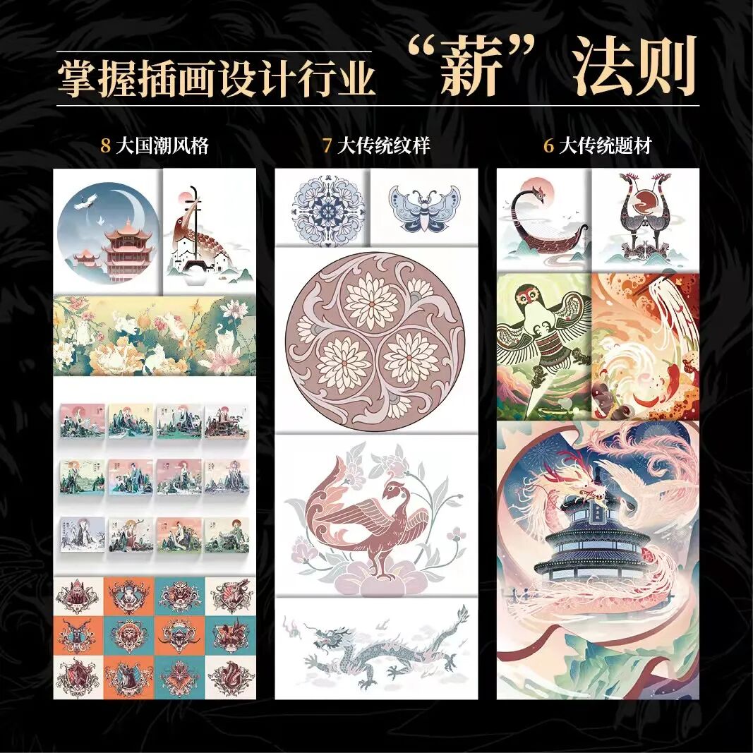 最新文章2023-09-11 插画+国潮,为什么是一条好赛道? 为什么真正的国潮,无法复制? 这是一把普通折扇,毫无个性,商城里,最多3块钱。 但是加上俏皮的雍正,批一句“朕亦甚想你”,它的价格翻了10倍不止,常常卖断货,这就是炙手可热的“国潮”魅力。 雍正折扇 国潮的兴起,开创了一条“趣味+传统”的创意增长点,不仅让我们的民族大牌焕发青春,河南电视台、百雀羚、大白兔奶糖、回力运动鞋....也能让所有的读者感受到一种跨时空乐趣! 那么,国潮插画,值得你“跟风”么? 也许,你还来不及思考这个问题。无妨,跟着我往下看,就有答案了。 01. 重新定义商业国潮 茶颜悦色的奶茶🥤,跟其他奶茶有何不同? 在仔细观察过包装后,我发现秘诀在于logo与产品上丝滑的“东方韵味气质”,为什么这样的奶茶会大排长龙,因为东方的美学是千百年来,深深烙铸的基因认同。 健美糖老师的作品 因此,如果你想要速成一幅出色的国潮插画,是很困难的,仅仅停留在堆叠国潮素材是最低级的做法。 你需要对中国经典细细挖掘,经过重启与再创,然后二次赋予其“商业价值”,这也就是“国潮插画师”的正确打开方式。 这几年来,多家知名品牌都在营销上进行了国潮版“权利的游戏”的大升级,有90后和00后为“国潮”贡献了超57.73%的购买力,国潮紧握着未来的发展趋势,只会越来越有“看点”。 插画约稿合同 这是某位插画师的合同书,后疫情时代,36氪发布了一份《中国主要城市的薪资》📜,数据显示中国的绝大部分城市的月薪中位数都不及6000元,甚至是一线城市。 因此,优秀的国潮插画,不仅能给品牌方带来巨大流量,同时也是水涨船高的插画岗位! 健美糖老师的上色案例 02. 过滤噪声,重归经典 如同上面所说,国潮风格并非在画面纯粹堆积东方元素,元素背后的历史文化才是国潮的核心所在。 我们得出这样有意思的公式👇: 国潮插画=颜值(东方美学)+故事(文化背景) 经典文化的研究与呈现决定了你作品是否美观,是否有内涵,才决定了你的作品是否能成为爆款。 健美糖老师的案例讲解 信息过剩时代,你可以在网上找到各种免费、破碎的信息,这有一定的作用,但大多数还停留在“技术层面的解决”。 如果你要过滤掉多余的“噪声”,寻找国潮文化的脉络学习,应该把目光投向被“时间之尺”筛选过的经典插画书上,重回经典阅读模式,才能真正品味国潮。 《韵味东方》作者健美糖 03. 偷师,向资深插画家 让手上的笔描绘古今风景,重塑心中的经典,这位国风画手健美糖老师专注经典国风已有六年有余,她的画风古典大气、极具张力,合作的品牌有华为、Amalee... 华为主题人气插画师 站酷首页推荐插画师 与华为、Amalee、天与空、朝颜、 高辉驻颜仙花酿、 Truth、ThinkFlyer品牌合作 她的代表作《生肖图鉴》、《生肖花语》 打破商业与传统文化的异次元 她 就 是 / 健美糖 / 长期专注是一种能力。 健美糖老师从大学接触插画开始,作业、比赛、甚至是毕业设计,都持续围绕着传统文化相关的题材进行挖掘创作,而专注的秘诀,在于“热爱”。 健美糖老师的案例讲解 授人以鱼不如授人以渔,为了更好地呈现自己心中的《韵味东方》,将自己的绘画心得毫无保留的分享,另外,还需要让新手也能够按照学习路径快速进步,健美糖老师查阅了大量资料,反复核实求证,最终以52个案例演练、概括精简的理论核心表述完成编写,得以问世。 导师部分作品和应用场景🏞️ 在探索国潮插画的道路上从未停留,目前已有超过1000+名学生加入学习。 05. 如何呈现有价值的作品? 《韵味东方 国潮插画绘制实例教学》是健美糖老师的诚意之作,本书总共5章,32个国潮案例+15个场景案例讲解,搭配2套线上课程(超50节课)。它升级了传统教学,“书课一体”的立体化模型,做到1+1>2学习效果。 书籍学习:侧重详细理论的指导剖析,详尽且完善,从N中常用构图分析,到具体大场案例心得,称得上是面面俱到。 2套课程学习:两位国潮老师亲自实操演绎,完全录屏,超过50集的大体量教你不放过任何细节的分解。 健美糖老师的案例讲解 既能沉浸在书香中,也能有教程的效率加持,一份价格,双倍快乐,就一个字:值! 两种方式结合,帮助你打通任督二脉,真正学到东西。 🔶第1章,国潮的商业探索:探索国潮插画的8种热门风格,以及插画在线上、线下的商业应用场景,插画师如何保护自己的版权。 健美糖老师的作品 🔶第2章,细化必学的绘画知识。平面构成中的点、线、面在插画中的表现手法和具体应用,同时也介绍7种常见的构图方式,以及12种比较有代表性的中国传统色。 🔶第3章,国潮元素的绘制。以传统经典纹样、古典乐器、吉祥花鸟、传统建筑等为主题,32个小场景案例展示,展示各个案例的创意表达和绘制方法(可搭配相关的案例教程),效果更佳。 健美糖老师的案例讲解 🔶第4章,插画中的构思与创作。传统美食和传统节日是国潮插画中的两大热门主题,11个精美案例,几乎覆盖这类主题80%的商业场景。 🔶第5章,主题插画的综合表现。以青龙、玄武、朱雀、白虎为案例,融会贯通前面几章所学的知识,从建立传统美学元素到大场景演绎;从0到1创造你的国潮作品集。 《四大神兽》之青龙的案例学习 书本的内容和案例,对零基础120%友好,也适合有一定基础的插画师作为灵感参考。52个全实操案例带练,书课一体全新模式,点亮你的高薪技