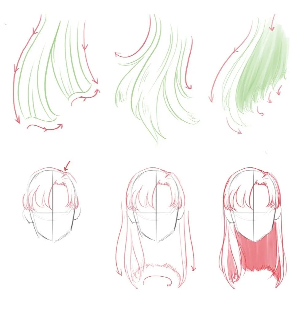 对于非常挺直的头发,我们可以画出笔直的垂直线。然而,如果我们想给直发一些生命和运动,想像一个被拉得很细的“S”形。