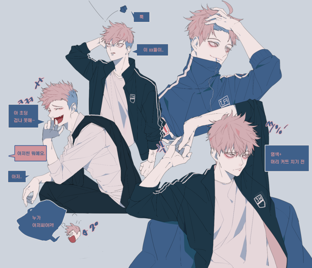 这种高级粉系配色,高亮的色彩明度,弱对比的柔和感,干净清爽的线条,勾画出一个个或阳光、高冷、或病娇惹人怜的帅气男孩。