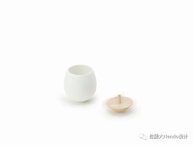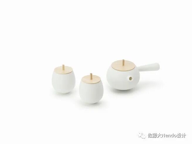 一套茶壶和茶杯。厚重的木质盖子提供了良好的绝缘性,以保持茶的温度,它尖尖的中心冷凝成液体,引导它回到茶壶里,而不是沿着侧面滴下去。盖子变成一个盖子,可以在喝茶的同时在桌面上旋转娱乐。