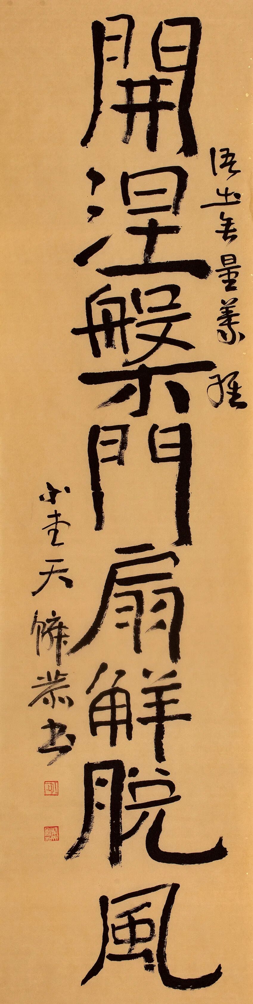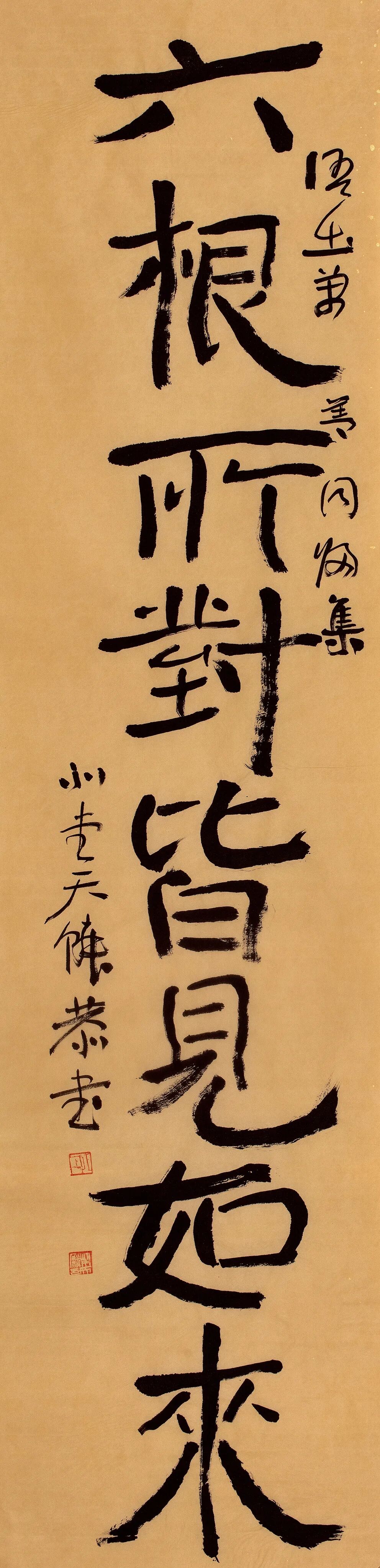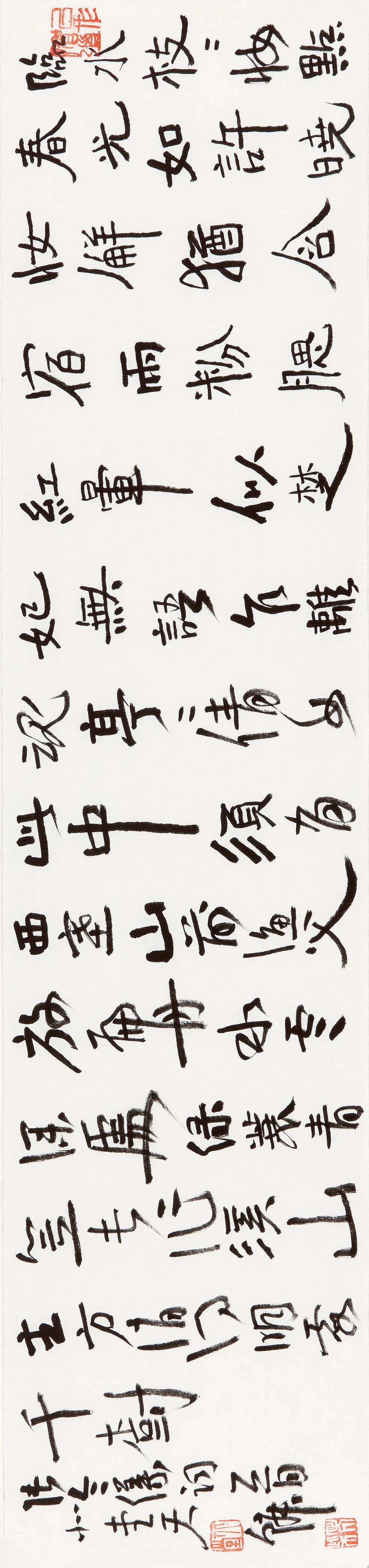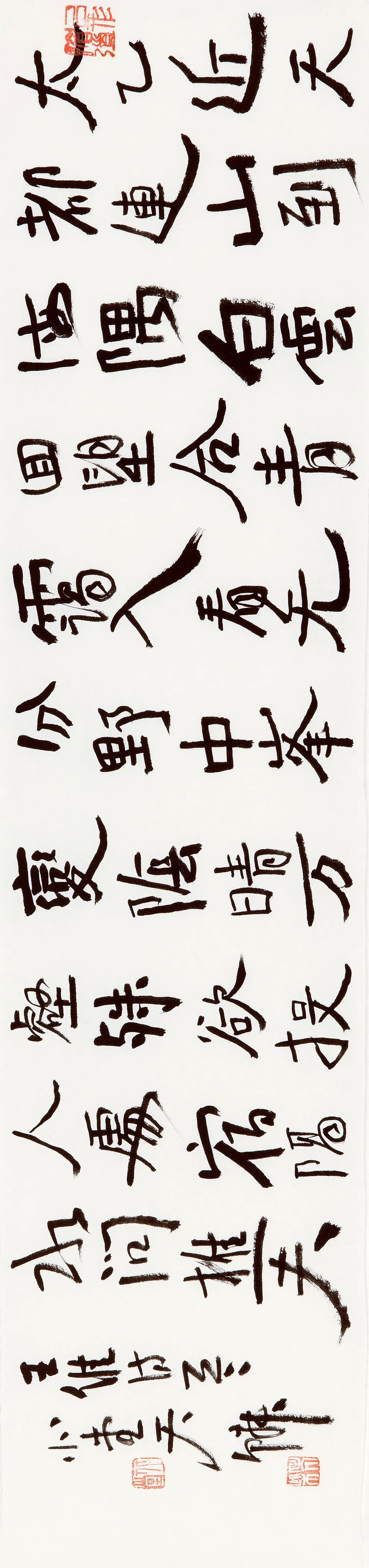 自从师陈国斌先生后,每每得见秦砖汉瓦,反复揣摩,流连忘返。那些青铜、兽骨或石头上的字迹,因岁月侵袭而呈现出的盎然古意,令他着迷。那一条条弯弯曲曲的线,似乎一眼望不到头,犹如一条幽深的古井,神秘而丰富,引人遐思。汉人旧瓦,秦人吉金,皆是他心仪之相。自此,他的书法线条里多了一种特别的意趣……