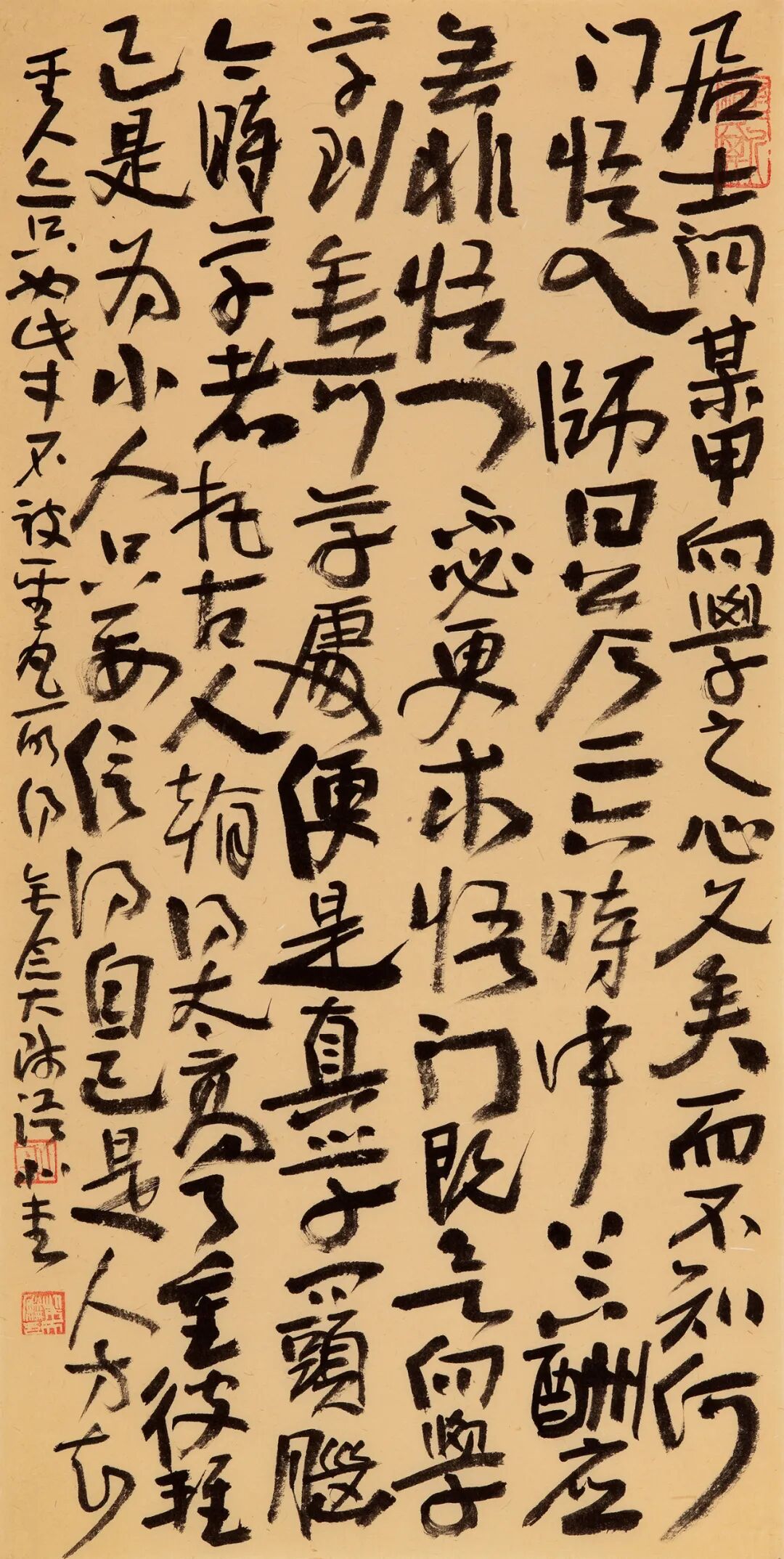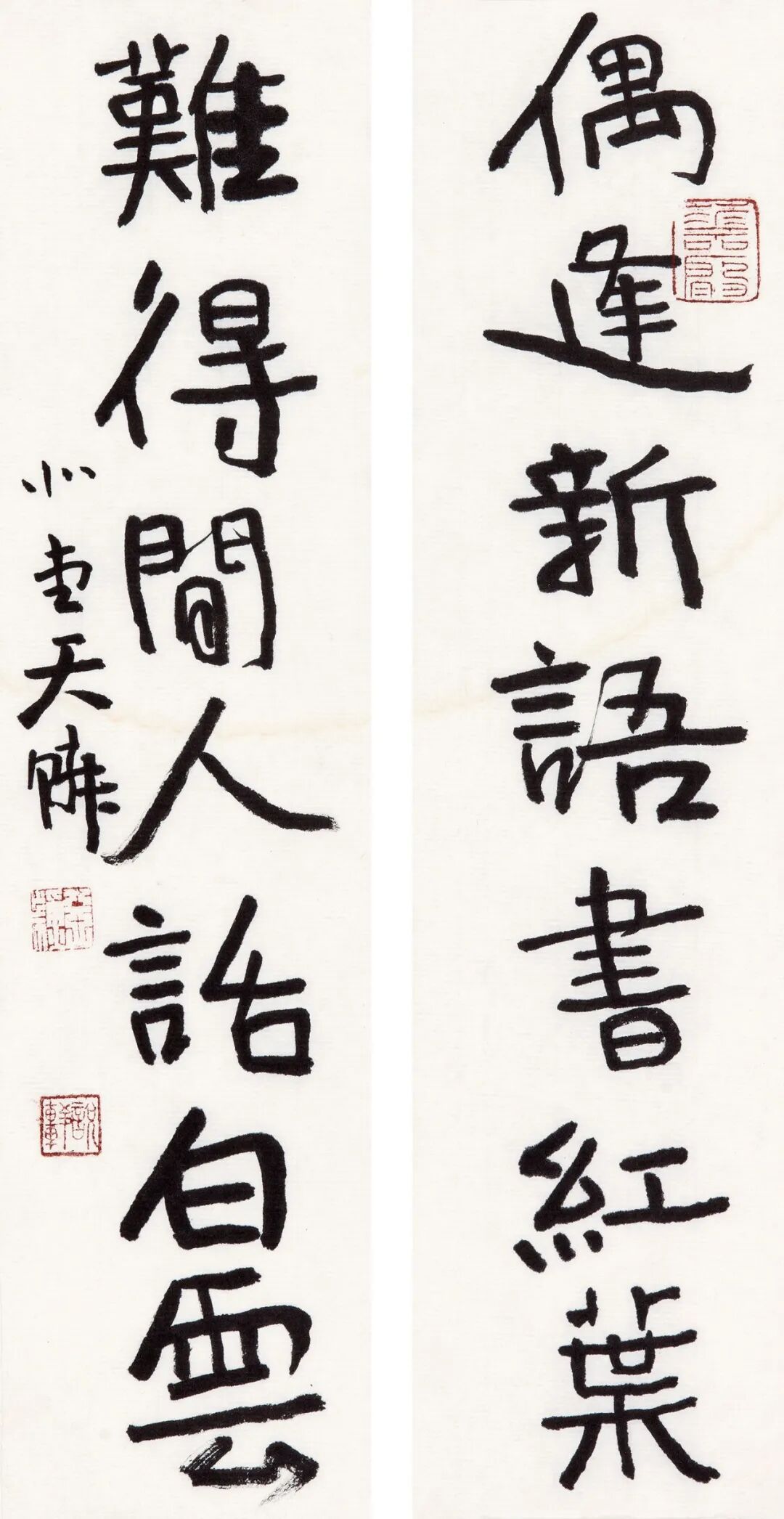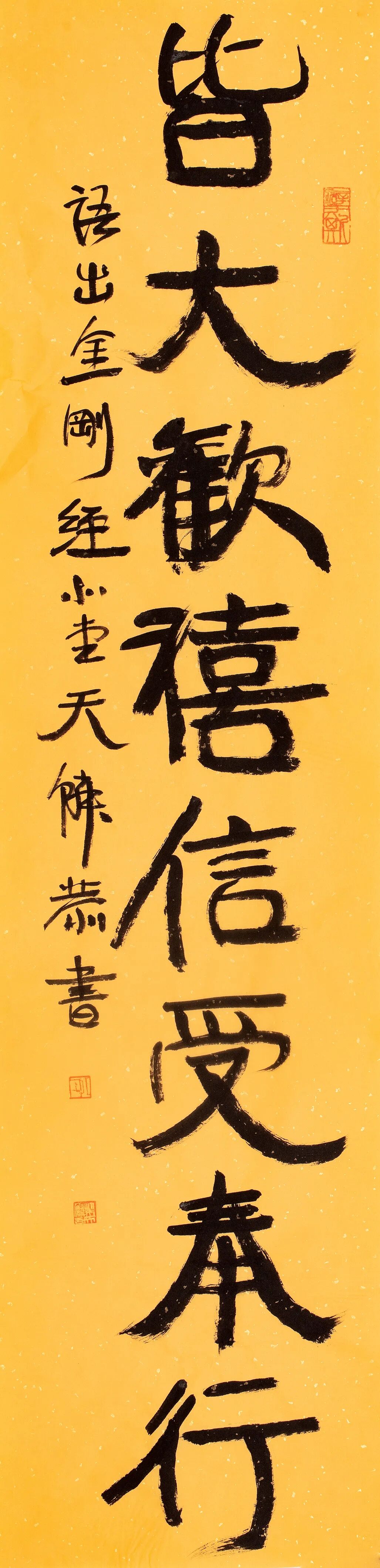 自从师陈国斌先生后,每每得见秦砖汉瓦,反复揣摩,流连忘返。那些青铜、兽骨或石头上的字迹,因岁月侵袭而呈现出的盎然古意,令他着迷。那一条条弯弯曲曲的线,似乎一眼望不到头,犹如一条幽深的古井,神秘而丰富,引人遐思。汉人旧瓦,秦人吉金,皆是他心仪之相。自此,他的书法线条里多了一种特别的意趣……