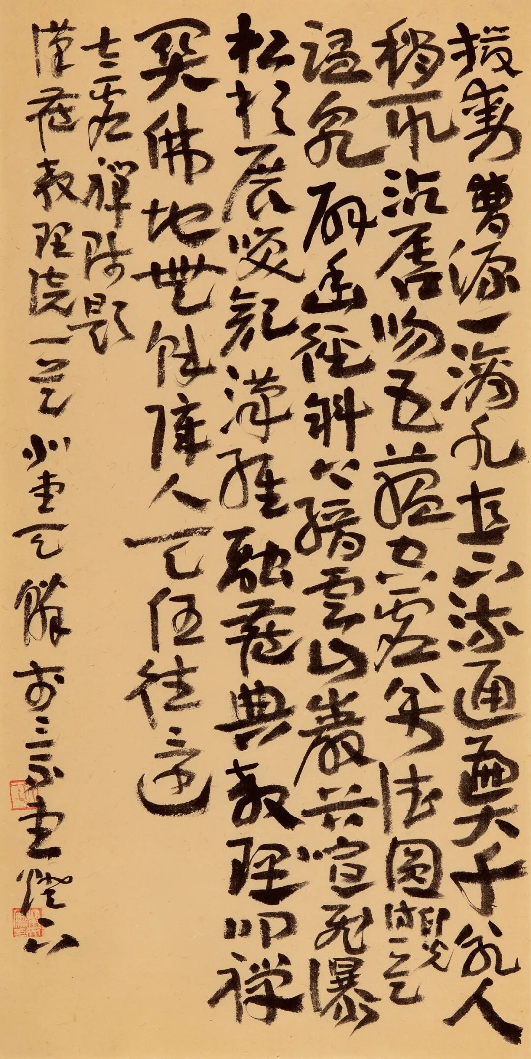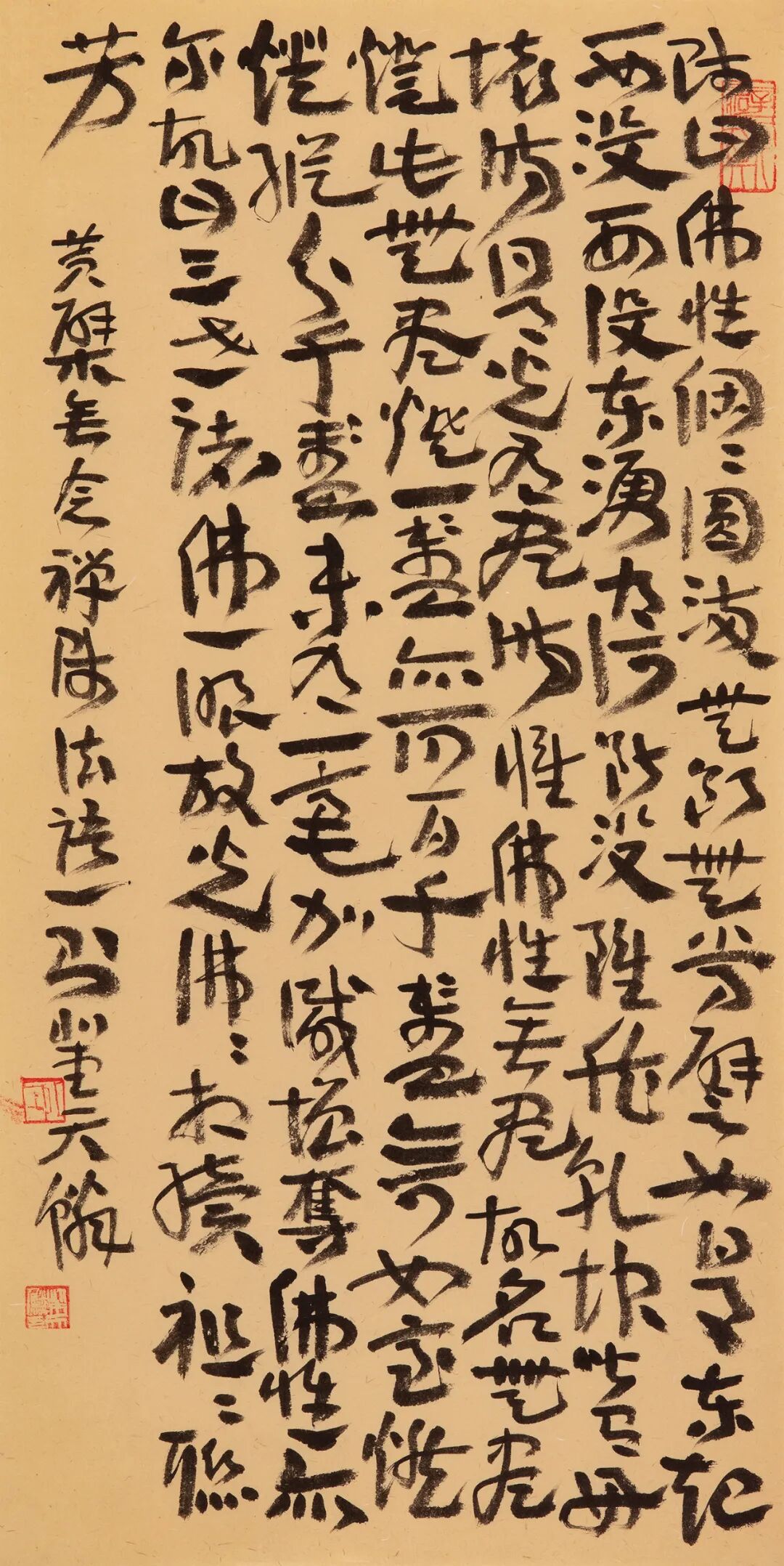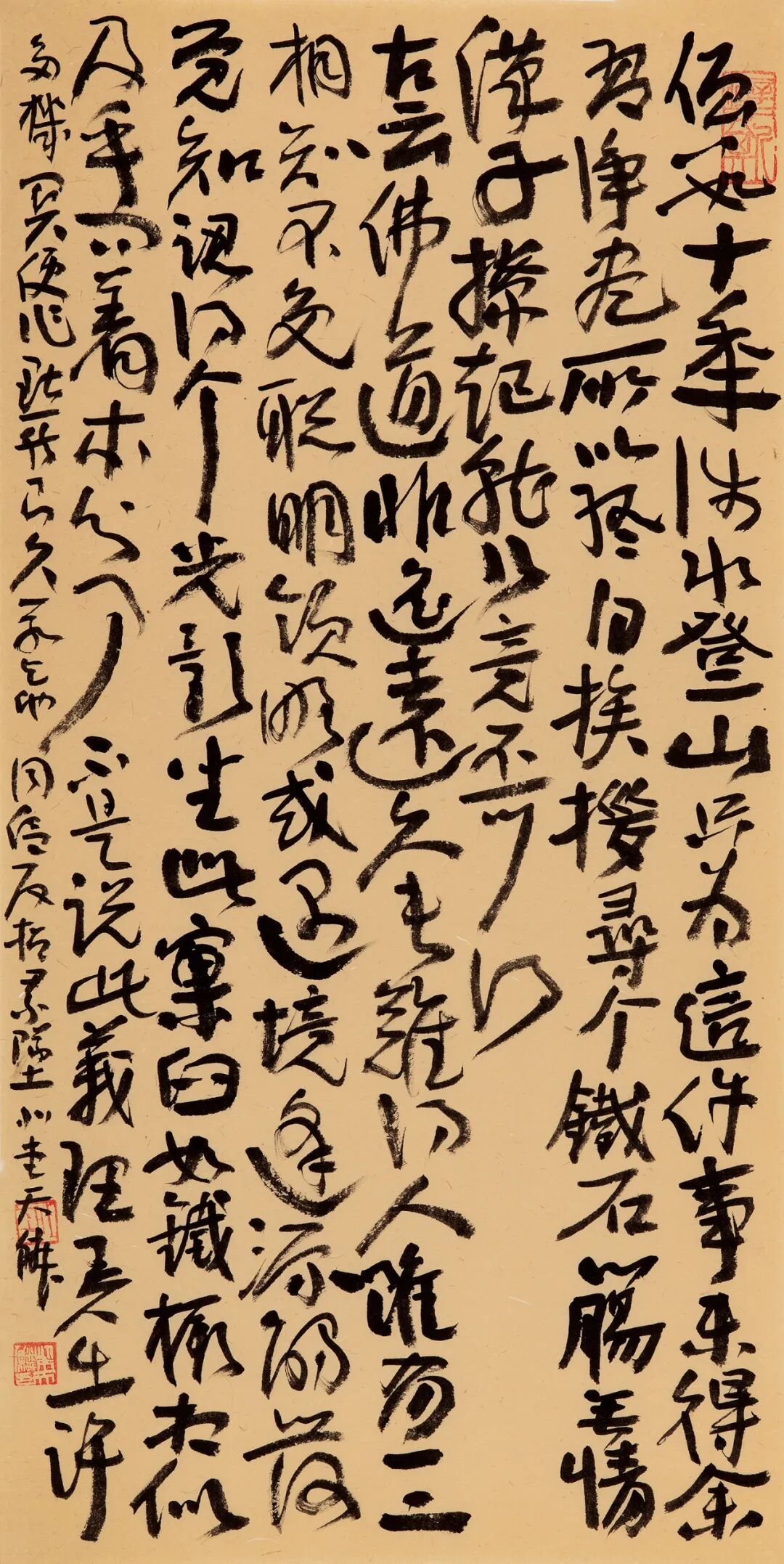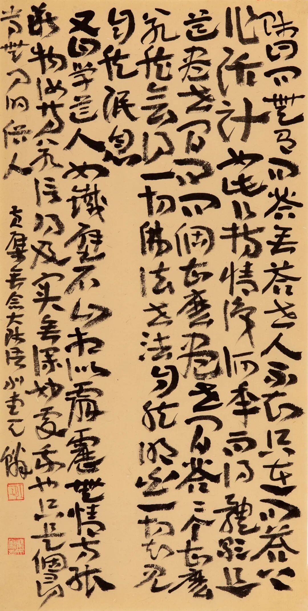 自从师陈国斌先生后,每每得见秦砖汉瓦,反复揣摩,流连忘返。那些青铜、兽骨或石头上的字迹,因岁月侵袭而呈现出的盎然古意,令他着迷。那一条条弯弯曲曲的线,似乎一眼望不到头,犹如一条幽深的古井,神秘而丰富,引人遐思。汉人旧瓦,秦人吉金,皆是他心仪之相。自此,他的书法线条里多了一种特别的意趣……
