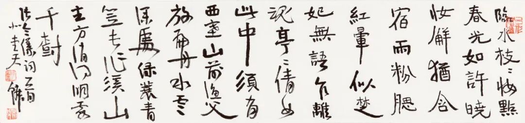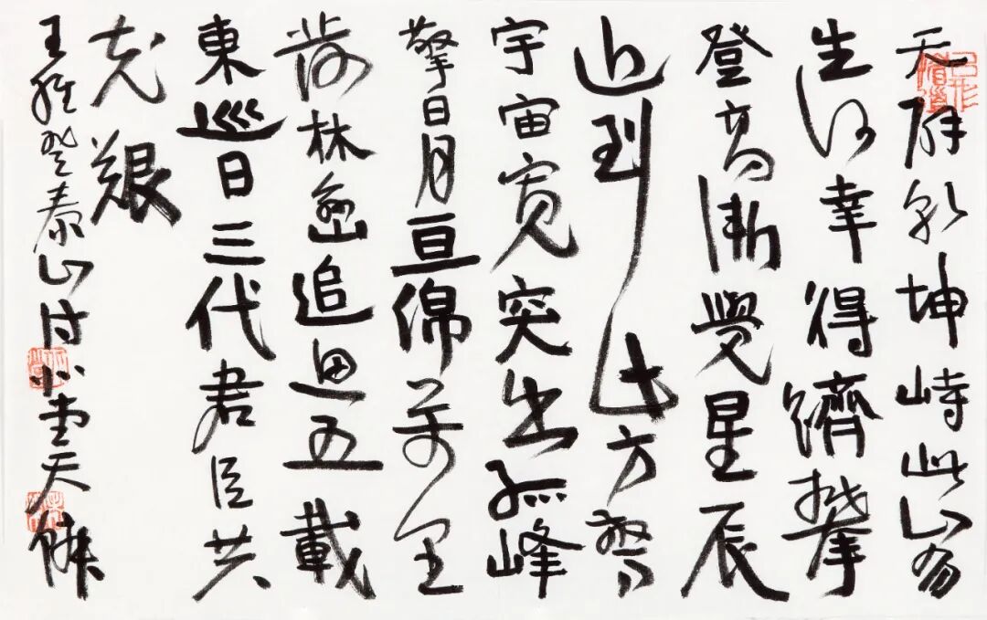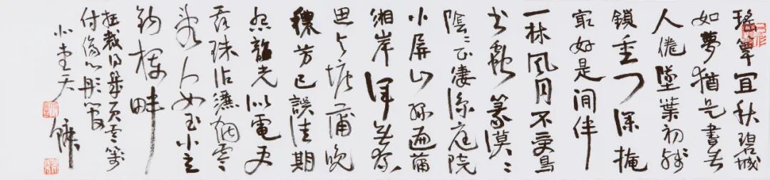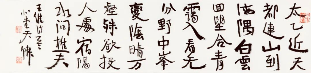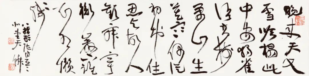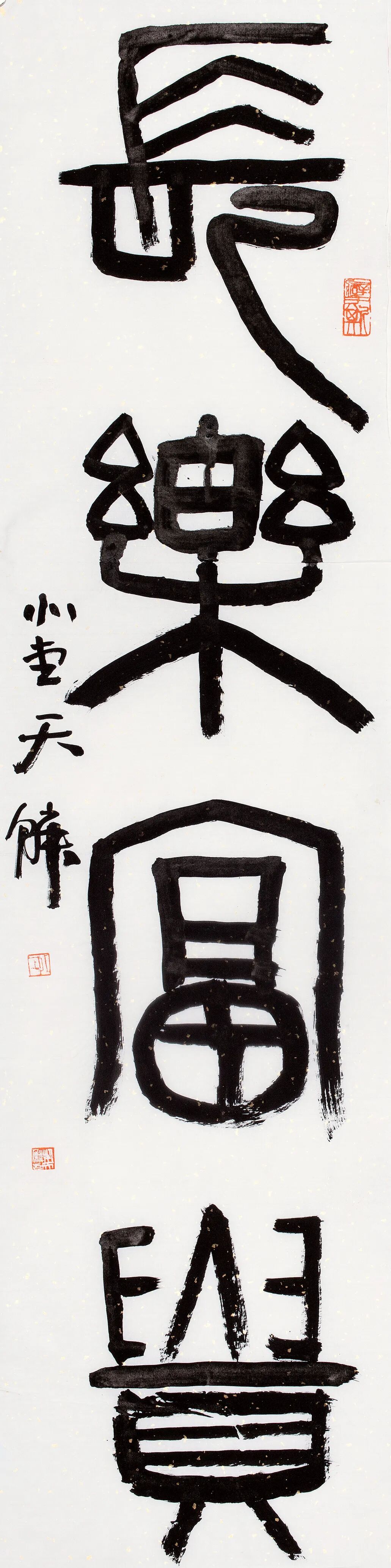 柴天鳞书风最近变化颇多,虽保持了原有作品面貌里碑的雄肆、大气,兼有帖的雅逸、清和,但最近这批作品,似乎隐隐夹杂着更多视觉空间的对比和民间书法造型的张力。他的一些看似随意的章草小品,一出手就颇具现代性,又透着层层古意。