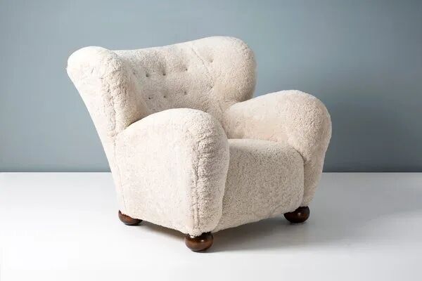 这种带有球形染色榆木脚的椅子是早期产品。它深受丹麦设计师 Fleming Lassen 1935 年定义流派的“疲倦的人”翼椅的启发。