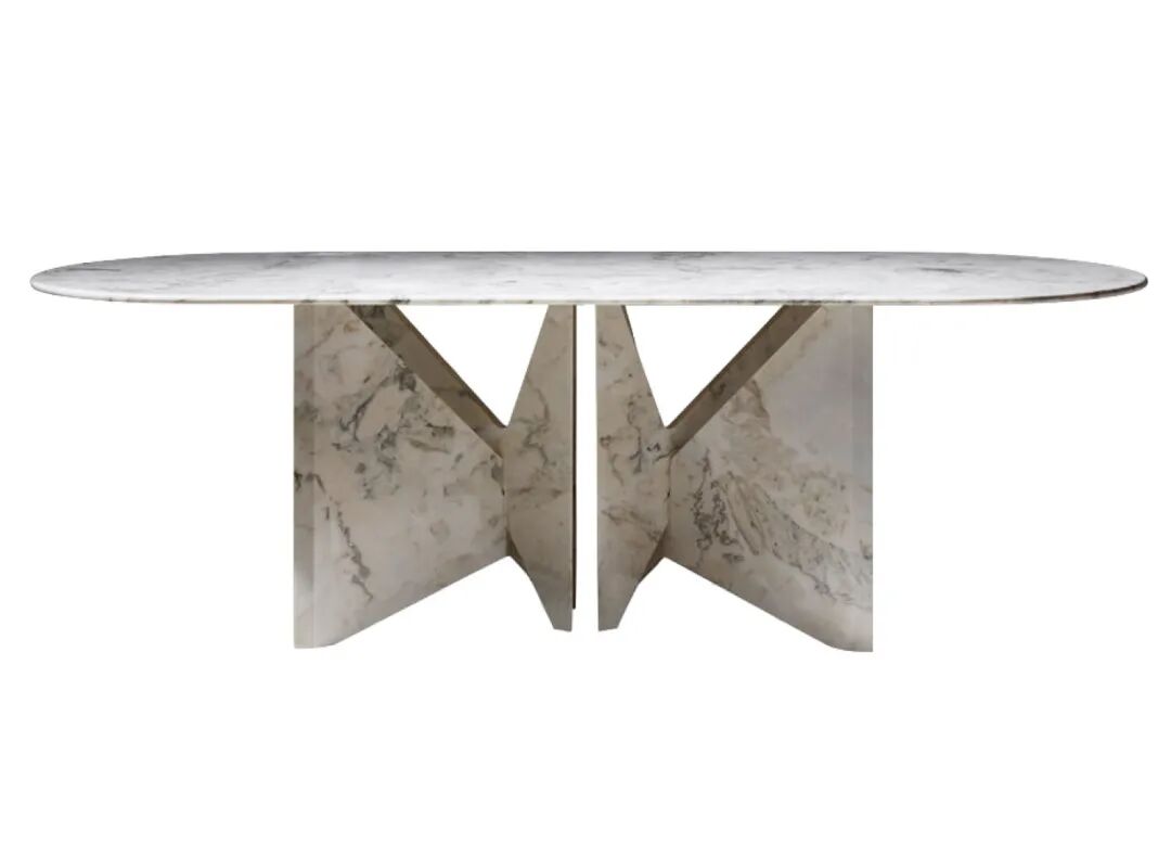 Lamina是依靠大理石板交叉的餐桌。Hannes Peer 从建筑师 Claude Parent(法国)或 John Lautner(美国)的概念作品中汲取灵感。