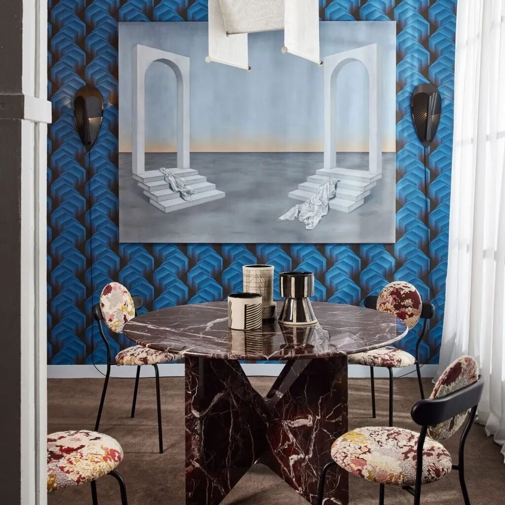 Lauren Piscone 和房主 Danielle Bernstein 合作从世界各地采购和委托制作作品,餐厅的空间由石灰色的餐桌、巨大的吊坠和老式vintage椅子组成。