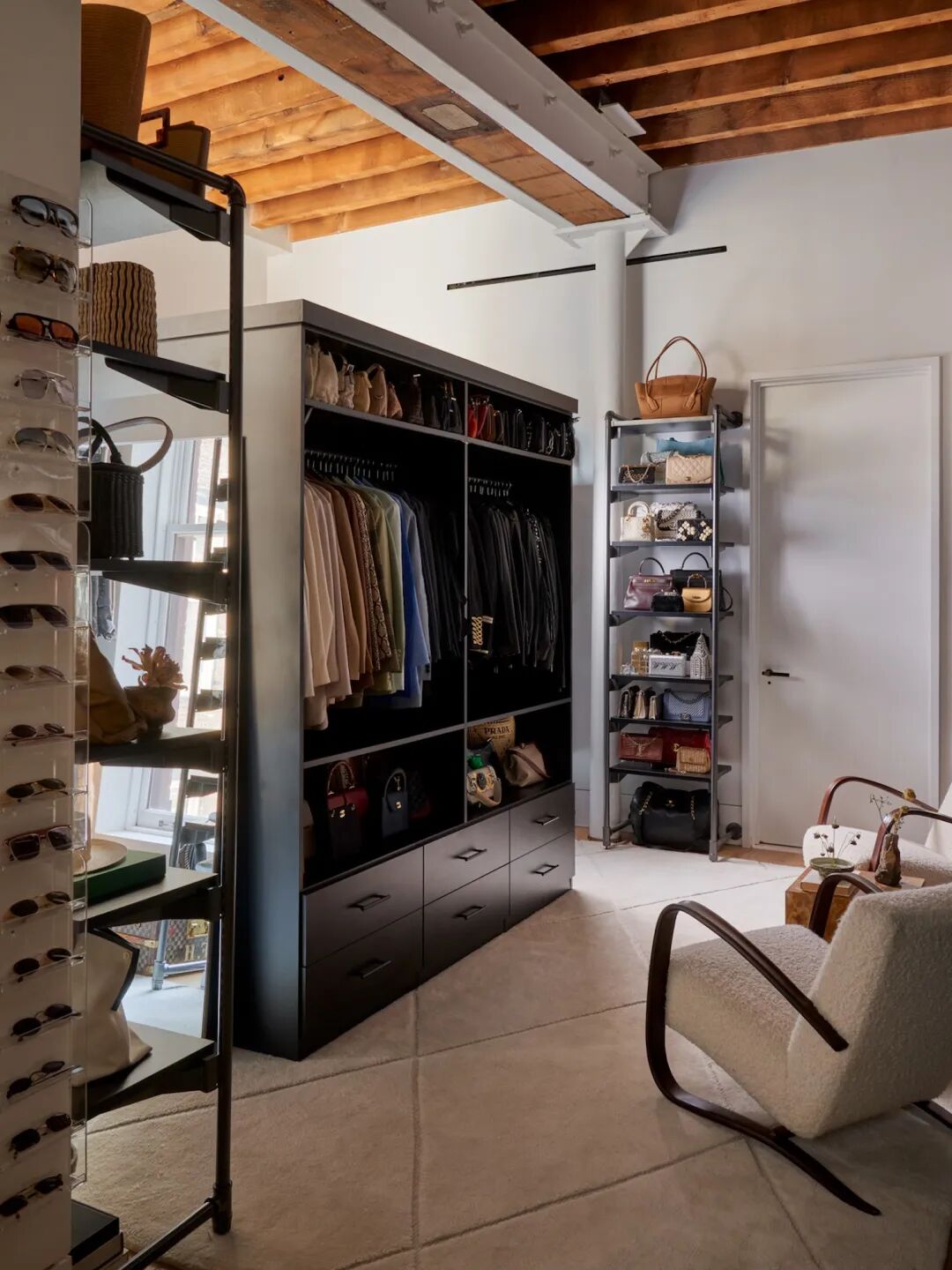 公寓的主卧室被改造成一个壁橱和工作空间。内部陈列室整齐的摆放着各种衣物、鞋子、配饰。