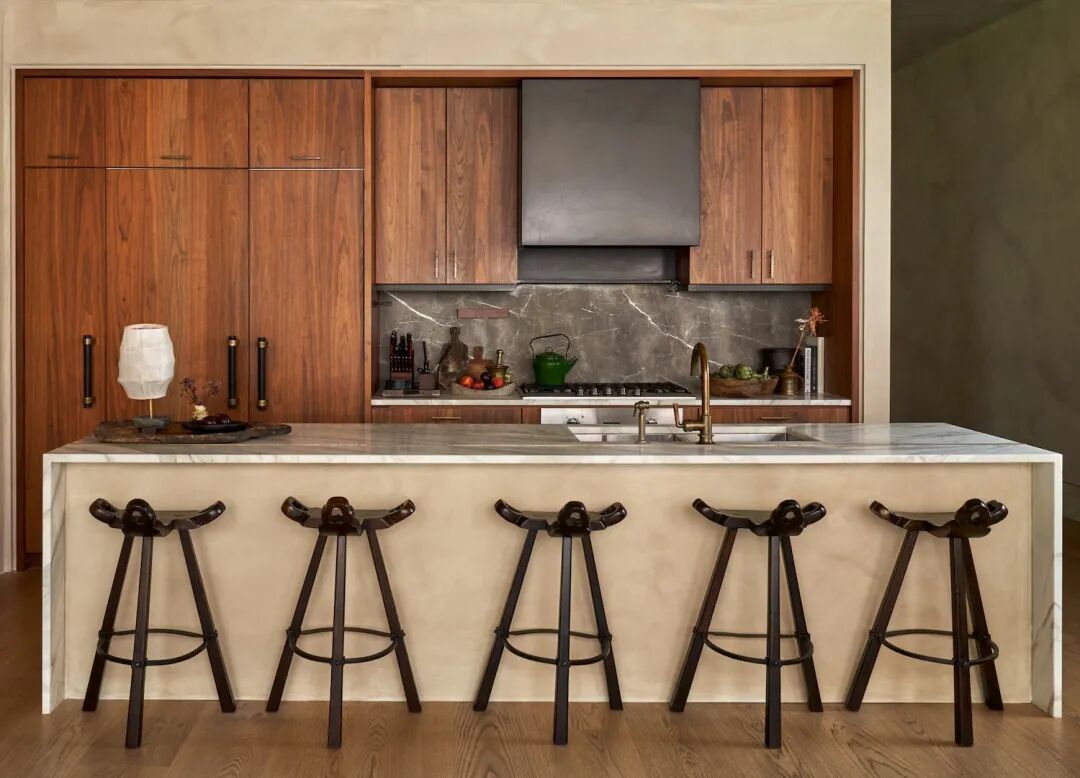 设计师和房主都痴迷于古老和复古家具中的故事,因此她们专门采购了具有独特背景和制作工艺的作品。开放式的厨房由定制橱柜和岛台组成,几把复古的吧台椅彰显了房主的好品味。