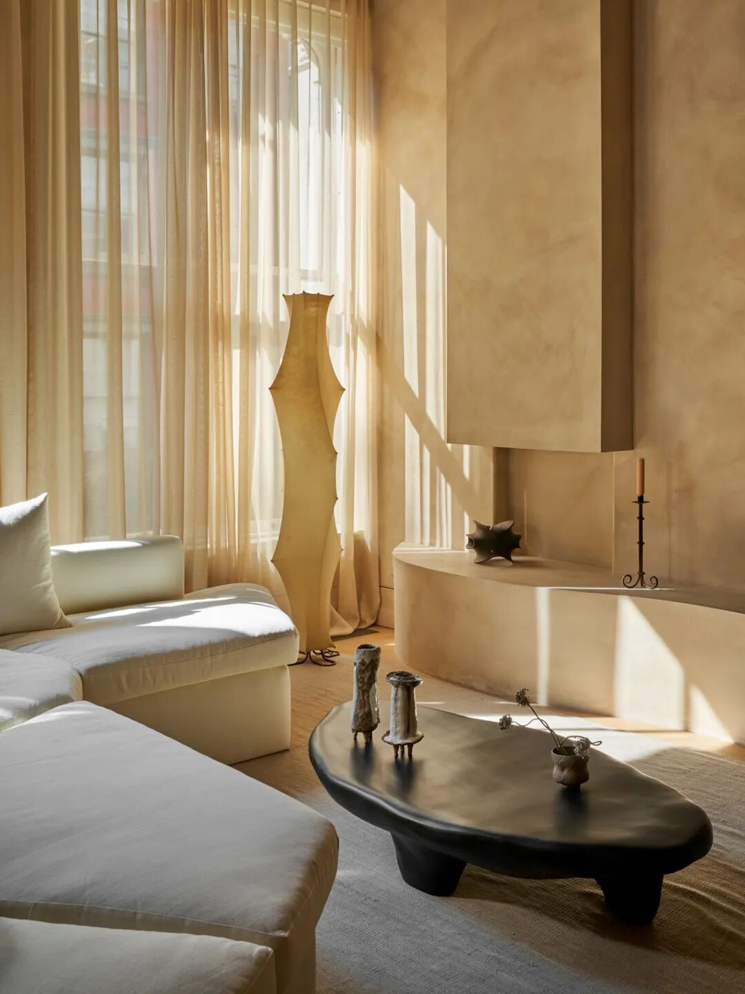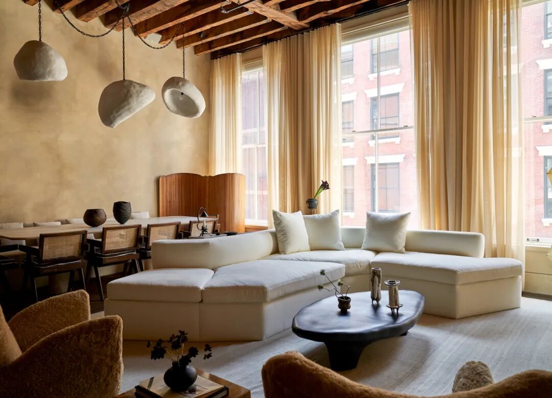 这间位于纽约市 SoHo 的公寓是由LP Creative 的室内设计师 Lauren Piscione和时装主理人Danielle Bernstein一起重新设计的。采用了日本侘寂设计原则,将公寓包裹在温暖、自然的色调和土质纹理中,营造出远离纽约市喧嚣的舒缓圣地。