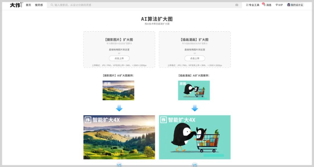 登录大作BigBigwork.com,点击【专业工具】中的【AI算法扩大图】按钮。