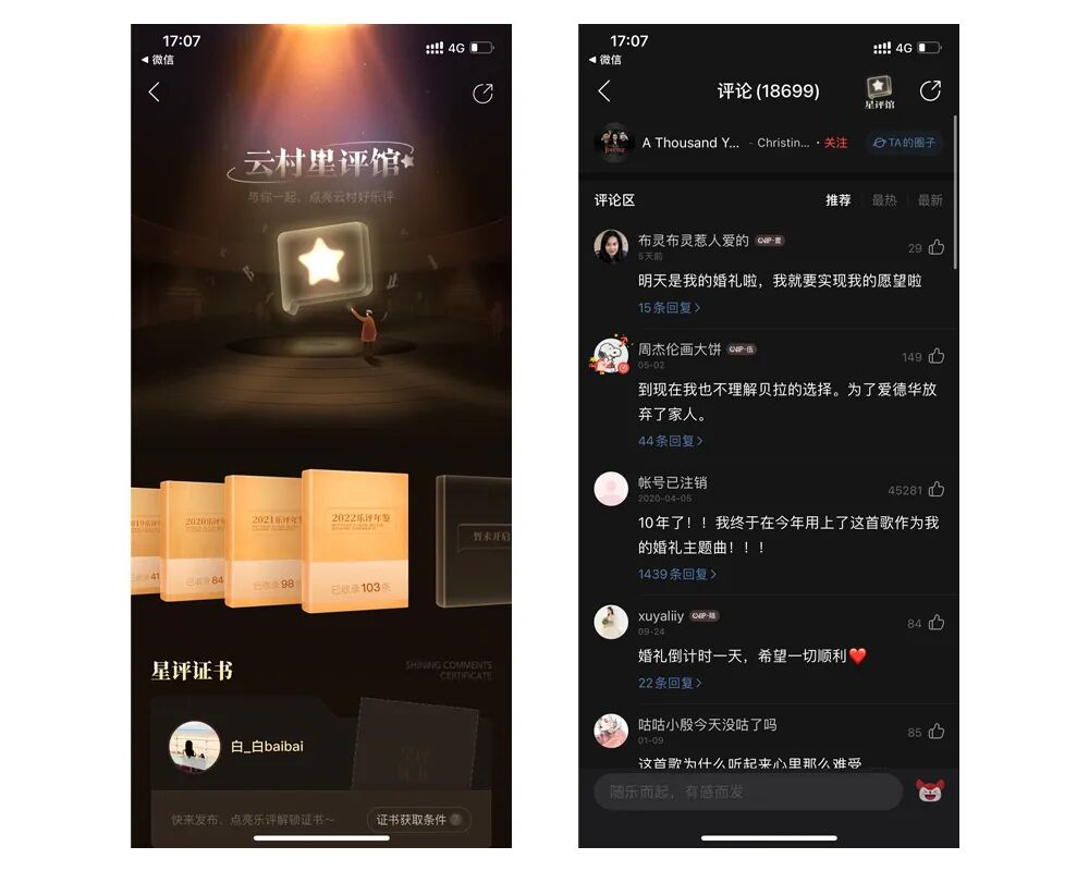 乐评,作为这个时代深受年轻人喜爱用来表达内心感受的方式,很容易引起共鸣与讨论度。「网易云音乐」上线「云村星评馆」,收录用户们选择的优质热门评论,并按日期收编至当年的「乐评年鉴」中,仪式感满满。不仅可以让用户协助平台筛选优质内容,还能增强用户的参与感,引导更多互动。