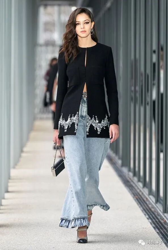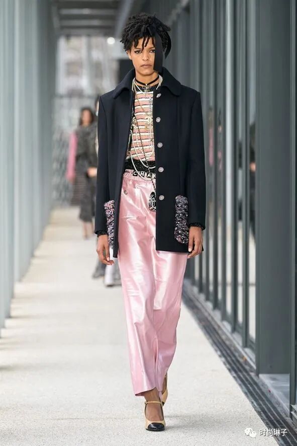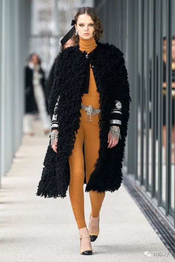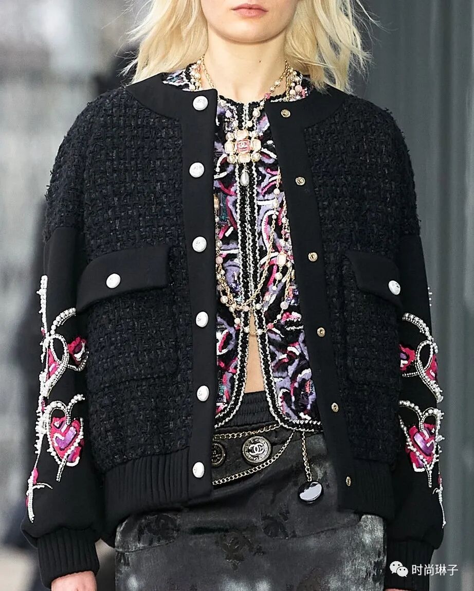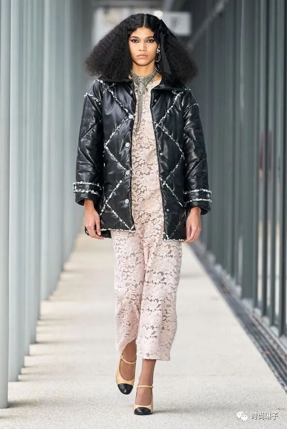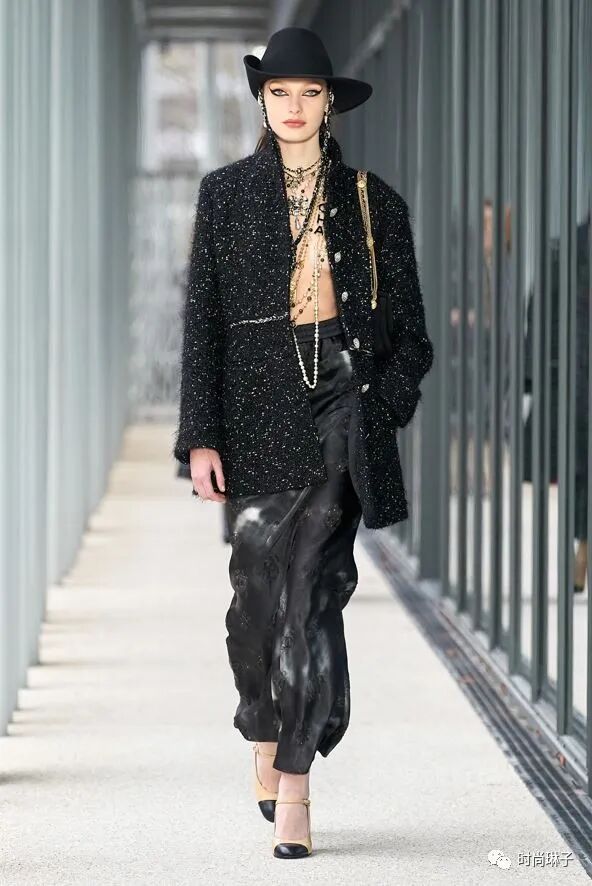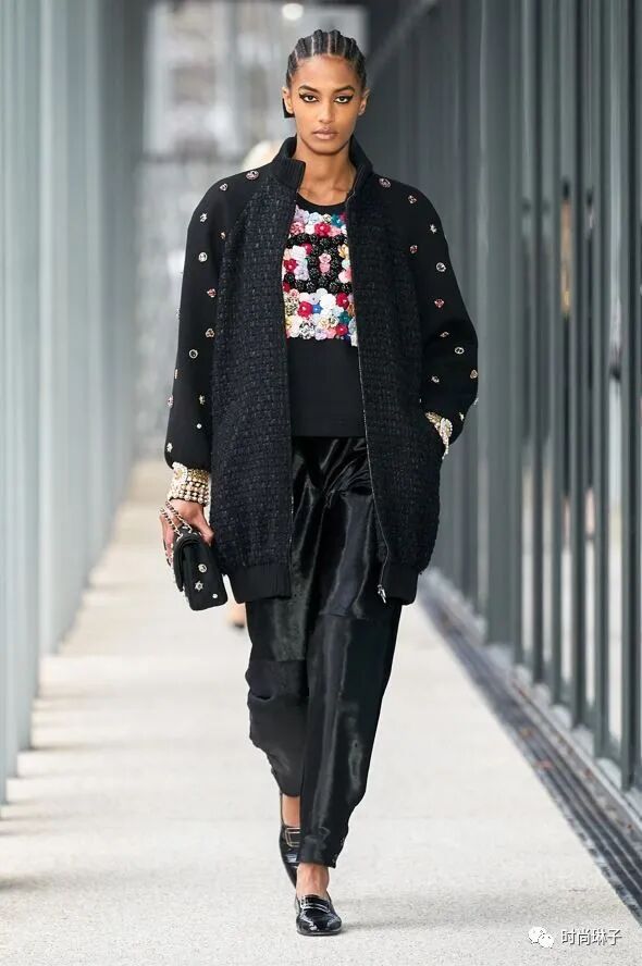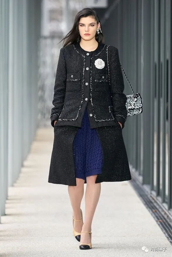 香奈儿 Chanel 2021/22高级手工坊系列以一件黑色长款外套拉开时装秀的序幕,亮片绣的网格状口袋和le19M大楼的外观相呼应。