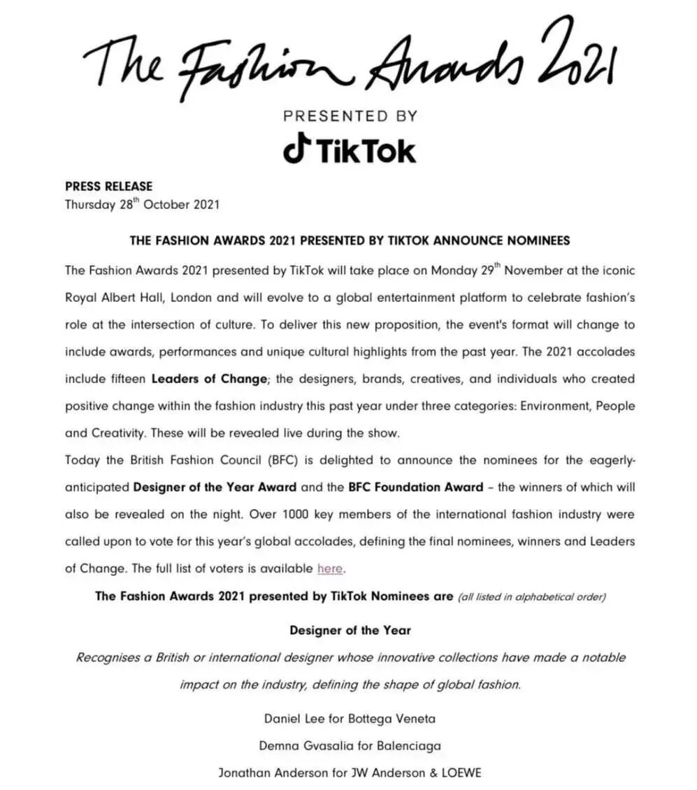 英国时装协会(BFC)日前公布了年度设计师奖和BFC基金会奖的提名名单,1000名时尚界的重要成员被召集起来投票选出今年的获奖者,并将在2021年由TikTok举办的时尚奖上公布。值得注意的是,包括Daniel Lee、Demna Gvasalia、Jonathan Anderson、Kim Jones、Miuccia Prada & Raf Simons在内的6位设计师被提名为年度最佳设计师奖。最终颁奖典礼将于11月29日在伦敦皇家阿尔伯特音乐厅举行,抖音海外版TikTok将成为2021年时尚大奖主要合作伙伴,为活动制作带来新的数字实现,包括向全球用户社区展示红毯仪式以及通过数字化展厅向观众展示新晋设计师。