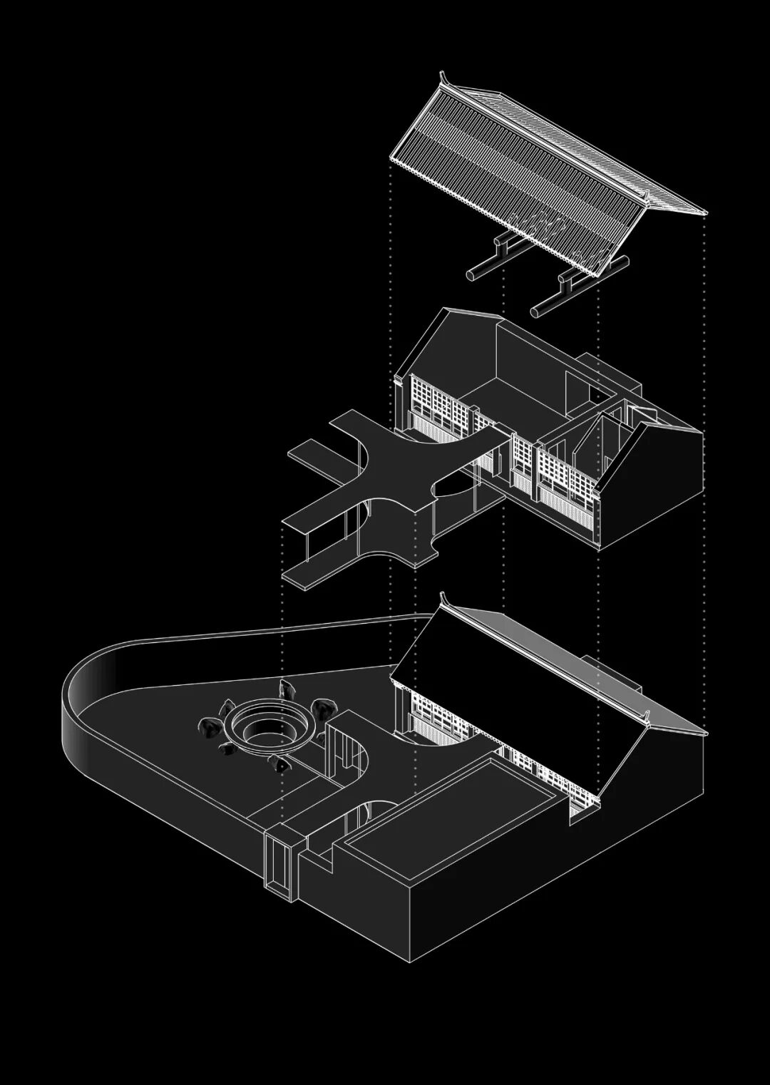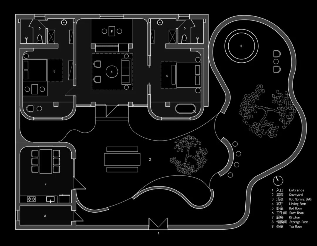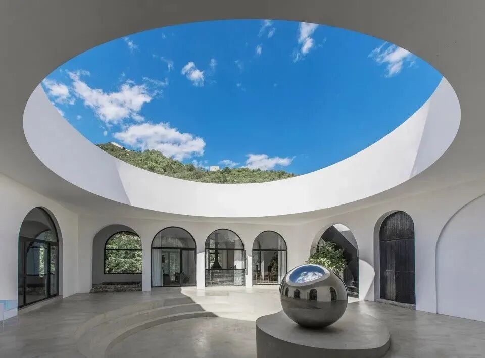 真实物质世界与虚幻印象通过镜面连接,设计将两个不同形态的体量通过镜面连接,一面是方形传统坡屋顶建筑,另一面是极简的白色半圆形围墙,而中间的镜面让其体量形成了对称式的延伸,,时尚院落配以中式传统桌椅,仿佛是一场无声的对话。