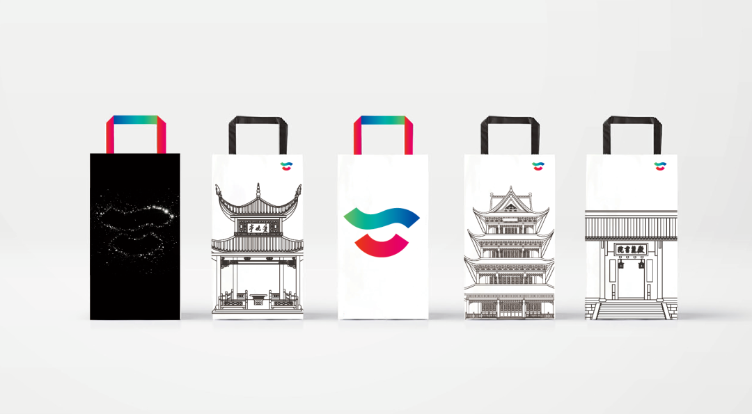 水墨造型的线条,渐变和间隙勾勒出月亮酒店、飞英塔、太湖三大元素。