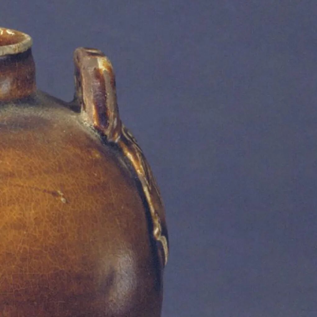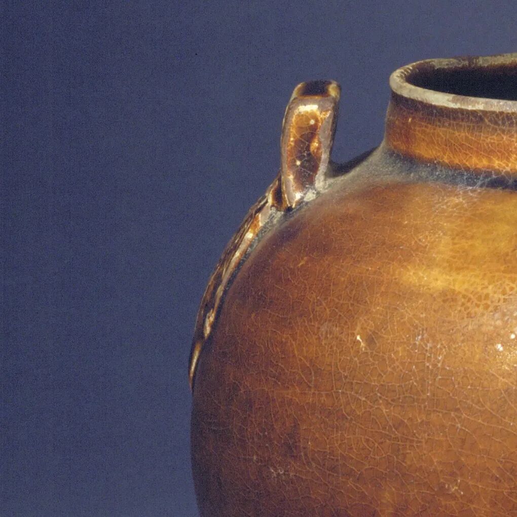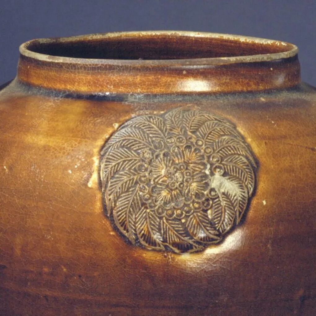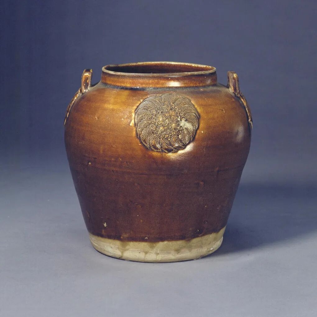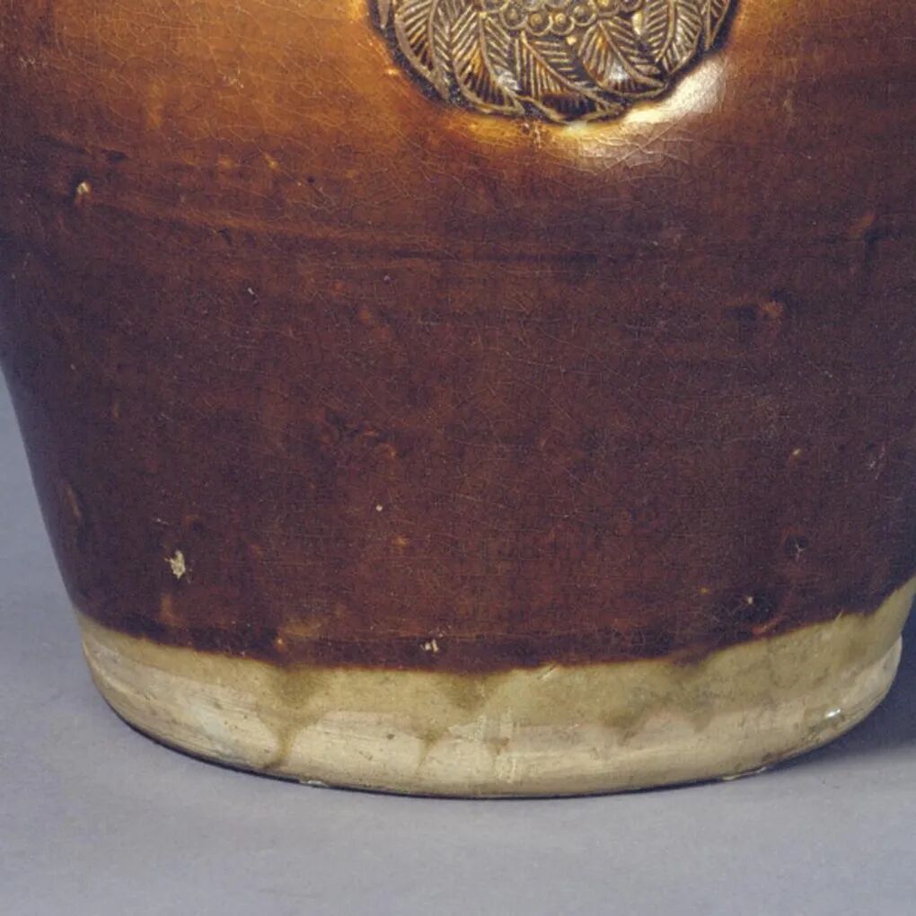 罐唇口,直颈,丰肩,圆腹,腹下敛,平底。胎呈灰白色,器身施褐中泛黄色釉。肩部有对称方形双耳及四朵模印贴花纹。近足处一周及底部素胎无釉。