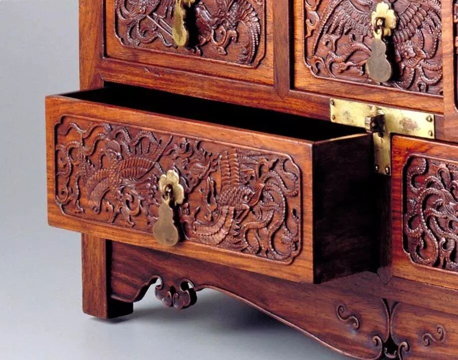 这样一来,整个家具天然浑成,毫无火气,髹饰用多道大漆,逐层打磨阴干,因为大漆透明,使材料的纹理鲜明地表露出来。