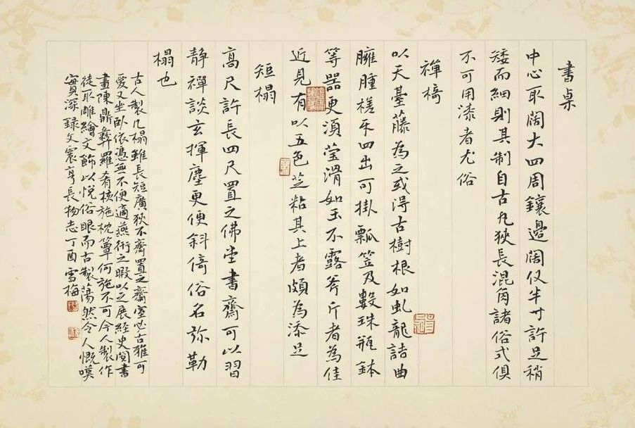 文氏尤其讨厌过分雕饰,案几若要雕饰,则“略雕云头、如意之类,不可雕龙凤花草诸俗”;交椅中“金漆摺叠者,俗不堪用”。