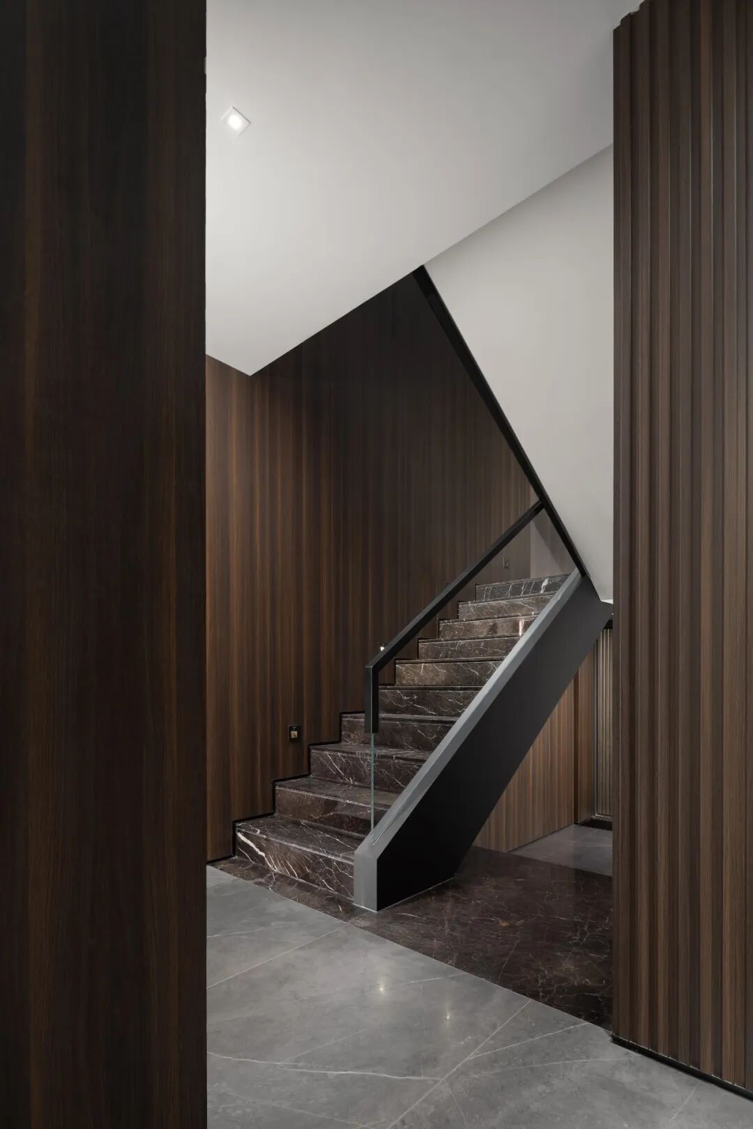 将连接空间各个楼层的楼梯定义成“项目的核心”。在这里,厚重的天然石材、朴实的木木饰面,是我们设计中无时无刻强调的一种和谐自然的氛围,我们希望时间可以在这个家慢下来,感受舒适的空间,营造纯粹而静谧的心灵享受。