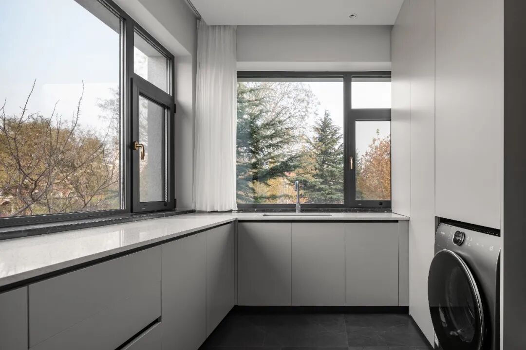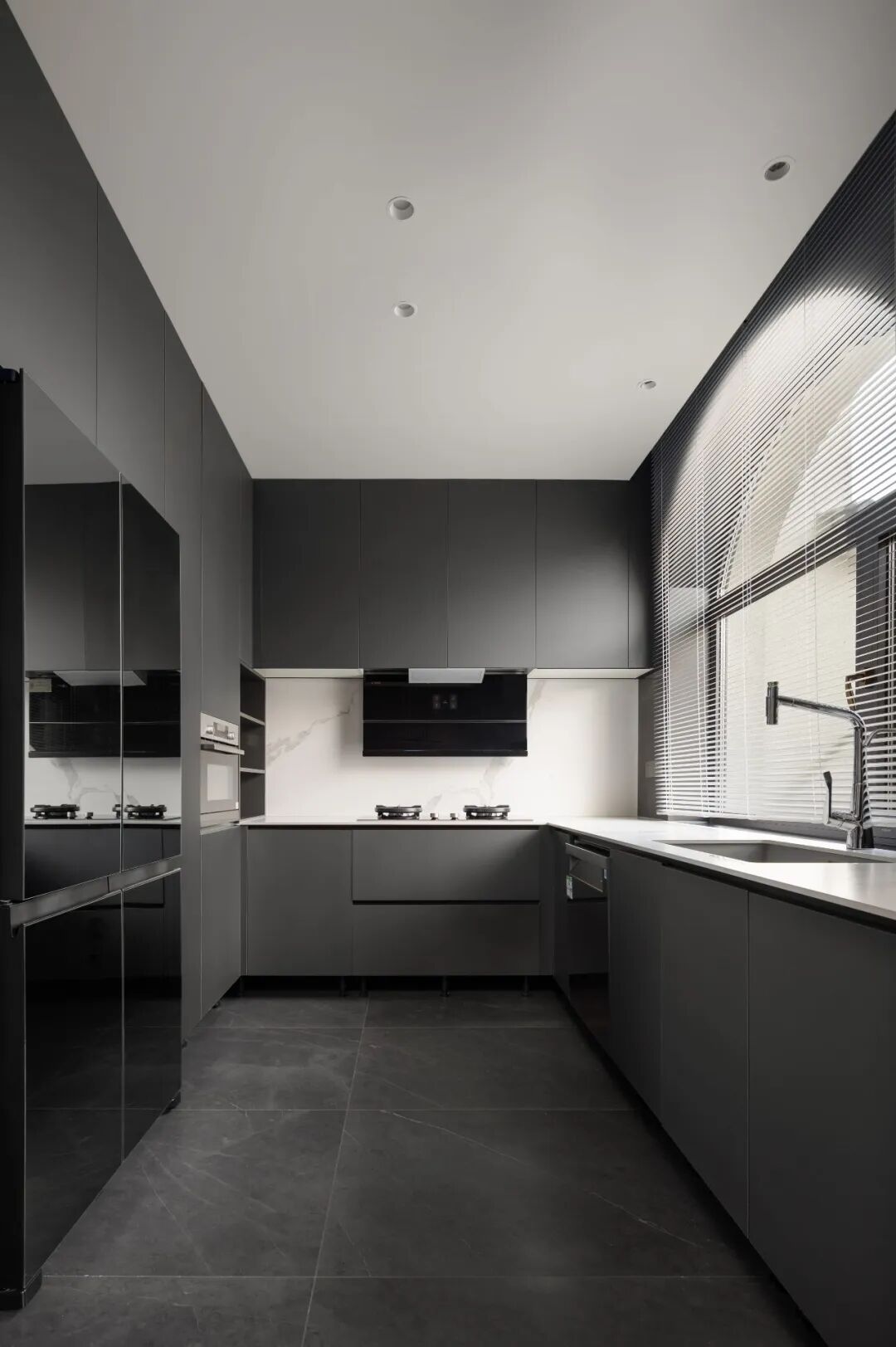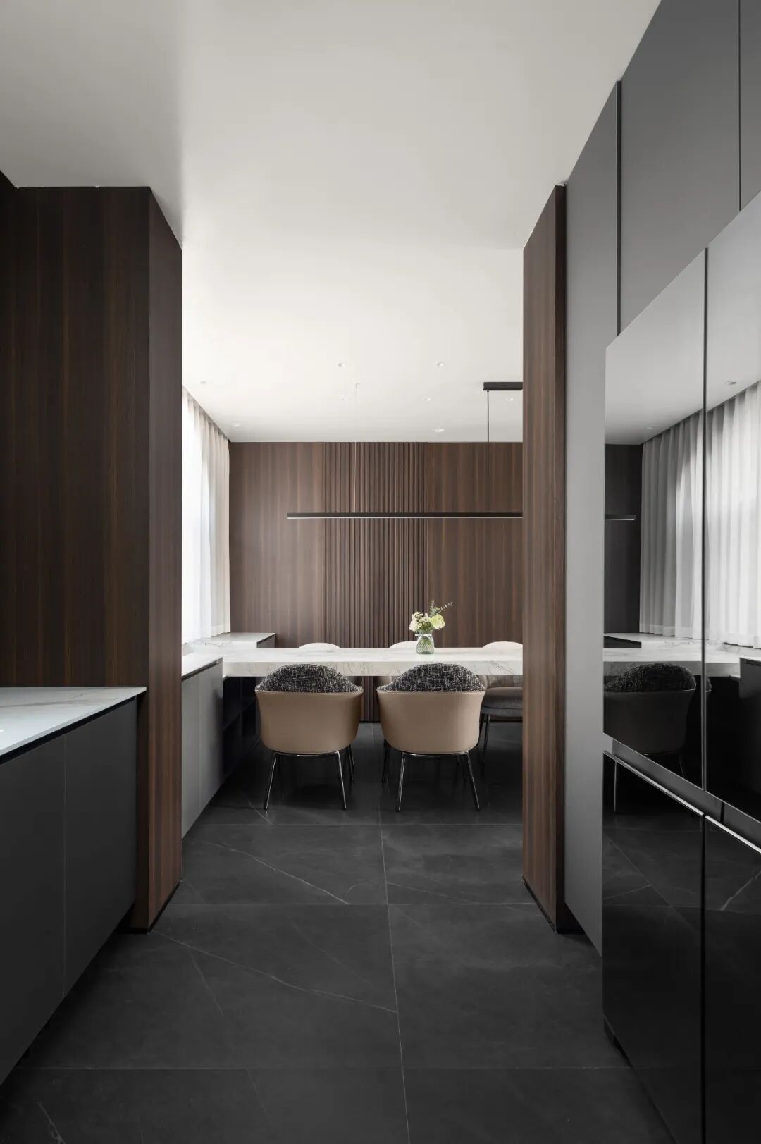 开放式的格局,延伸至餐厨空间,去繁就简的设计原则下,设计消融绝对界限,只以单色体块,去捋清功能划分,疏而不空,比例有度。