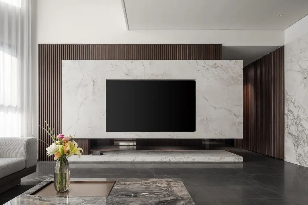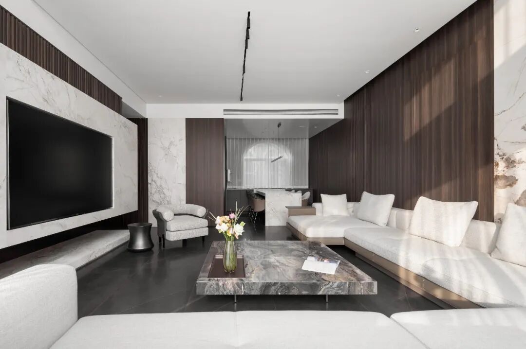 阳光透过玻璃,与室内大面积的白色撞个满怀,暖调的木饰面贯穿整个空间,营造休闲、自然和干净的空间主场。客厅整面的木饰面与石材组合的背景墙,保留了材料的原始质感。