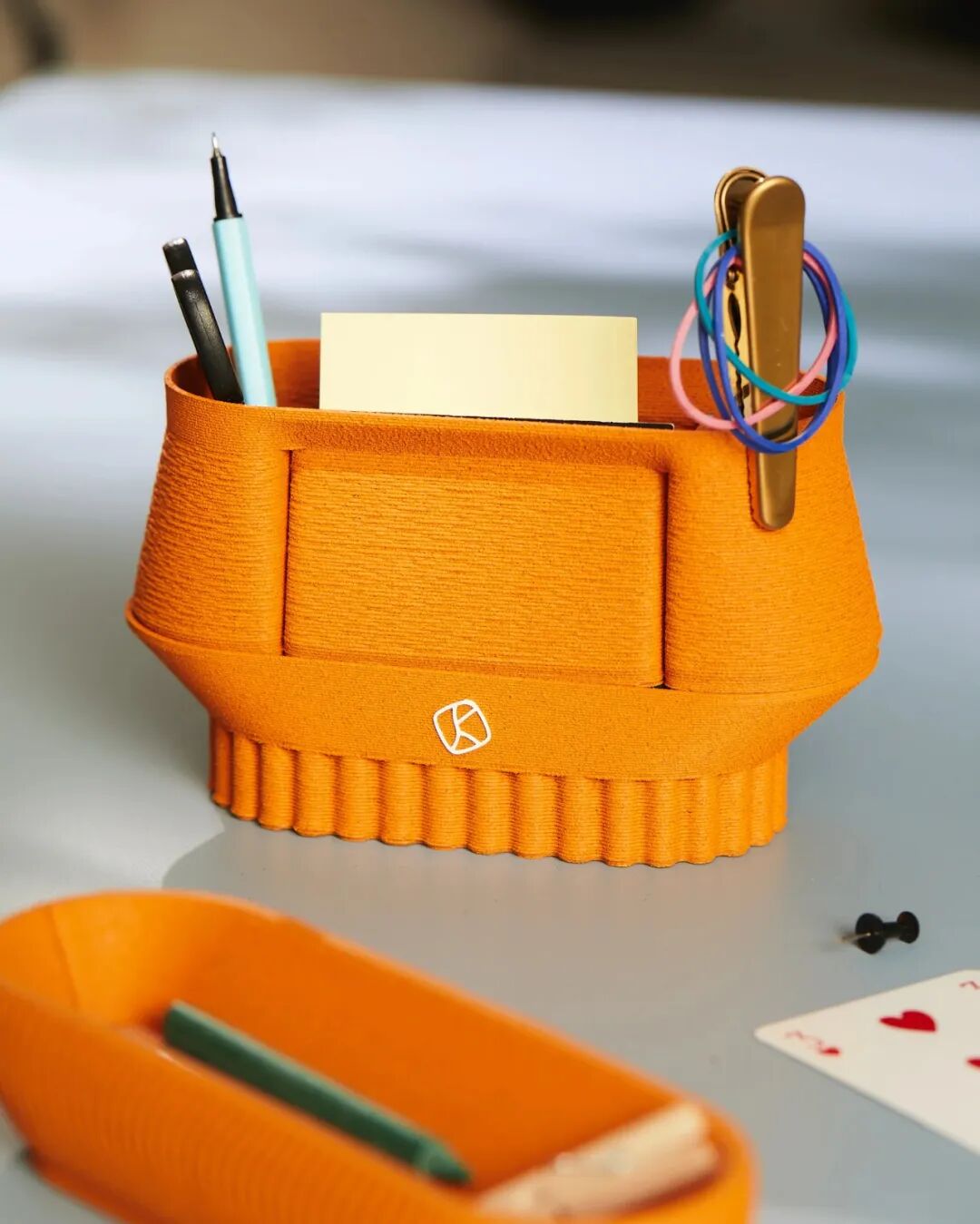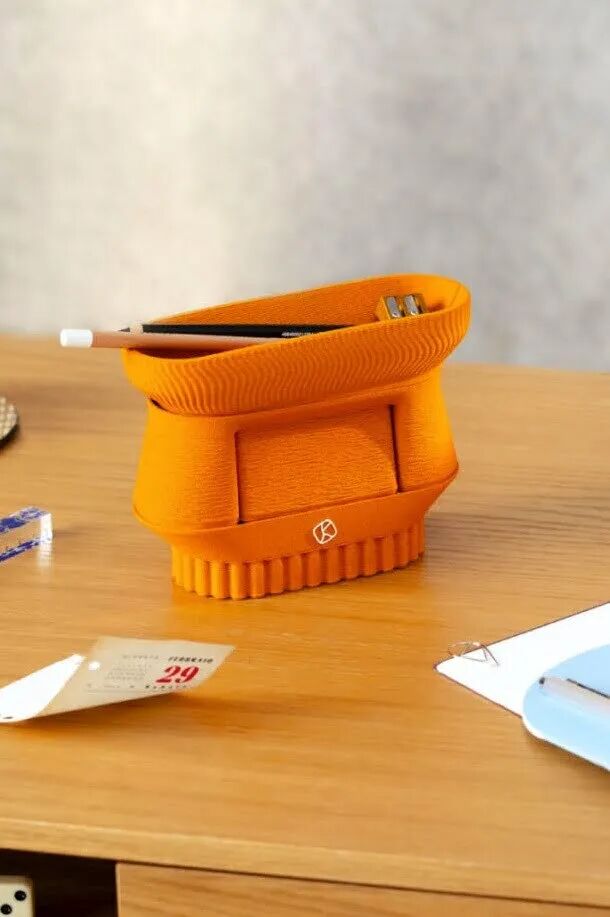 这是一款由3d打印制成的橙皮办公桌收纳产品。三个不同形状的容器来隐藏您的混乱,释放您的办公桌,并恢复视觉秩序。