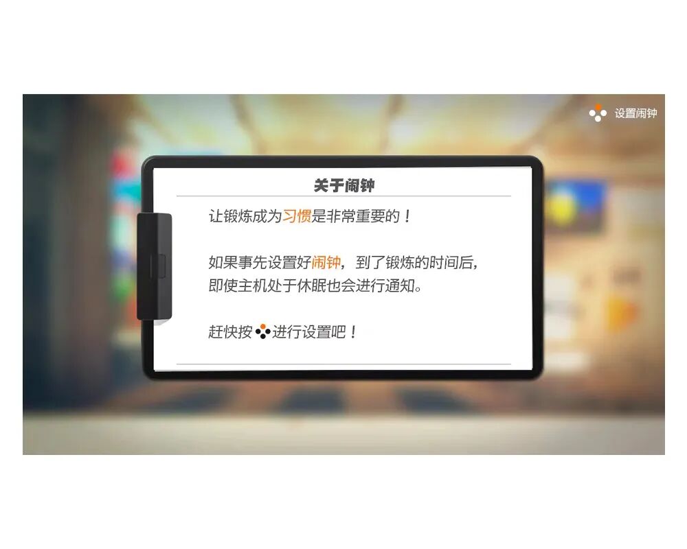 对于主打健身的游戏而言,培养用户养成锻炼的习惯,才能提升游戏打开率和用户粘性,让用户感受到游戏的价值。Switch游戏「健身环大冒险」,鼓励用户设置运动闹钟,来提醒自己坚持每日锻炼。考虑到游戏主机在用户不使用期间,通常会处于休眠状态,系统被设计成了如果事先设置好闹钟,到了锻炼的时间后,即使主机处于休眠,也会进行锻炼通知。