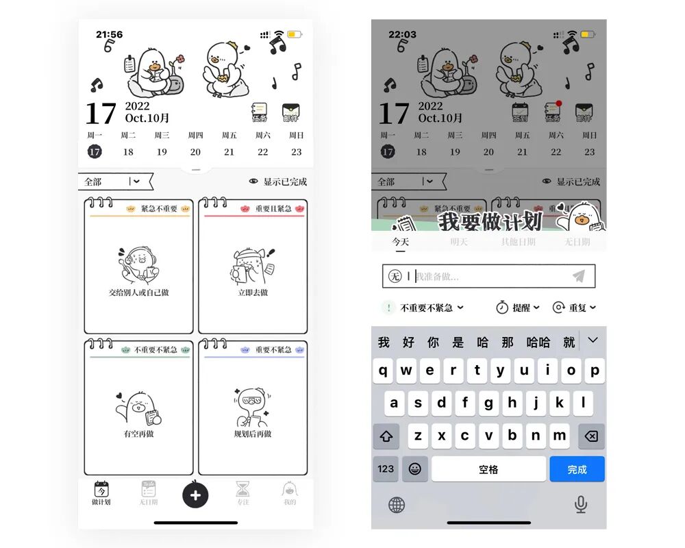 制定计划的原理多种多样,从四象限到GTD再到子弹笔记,令人眼花缭乱。「我要做计划」APP选择只做好四象限法则这一种形式,所有功能的均围绕这个法则,理论要点也印在界面上,让用户立刻上手贯彻执行。从界面设计上来看,App的风格遵从了可爱的调性,多处应用产品的ip形象,但这也使界面显得「过满」容易产生视觉疲劳。但总体来说,欢快的风格、简易的操作对制定计划的新手极其友好啦~
