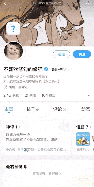 「最右」个人主页增加了个人状态的互动玩法,用户可以通过多种手势与他人的头像进行互动并触发状态,触发状态之后还能通过陀螺仪控制状态的位置,两个创意结合在一起有很多用户也开发出了非常有意思的玩法,是个非常不错的品牌记忆点。投稿:LynnRGB