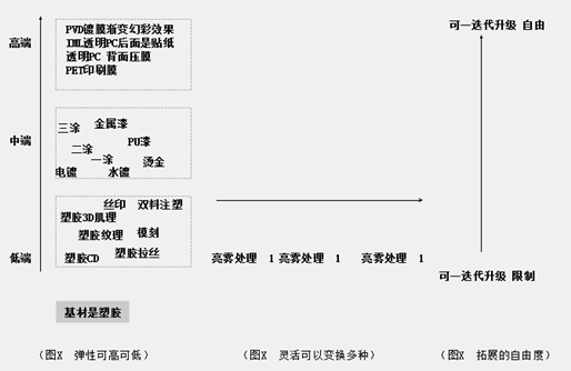 弹性可以控制档次高低,是指建立在一个基础材料之上,可以形成高中低端的效果。例如基础材料是塑胶,可以注塑PC全透明并赋予PPD镀膜/IML形成高端效果。可以注塑黑色赋予一涂至三涂或者喷金属漆配合丝印烫金形成中端效果。可以在塑胶的边缘制作CD纹理或者肌理形成低端的效果。以上部件的形状并没有改变,即是材料改变,施加了不同的工艺。