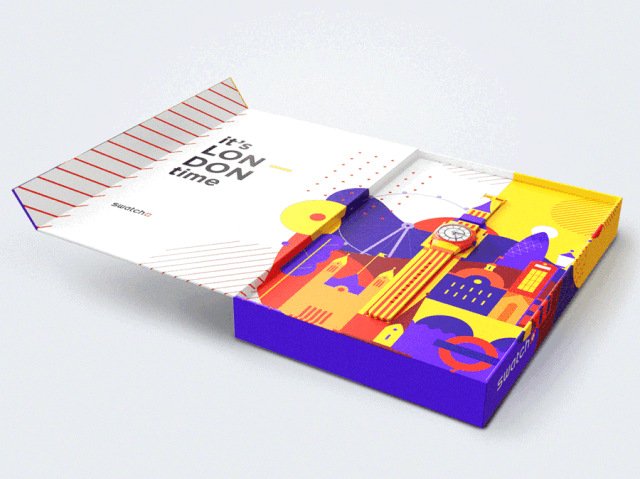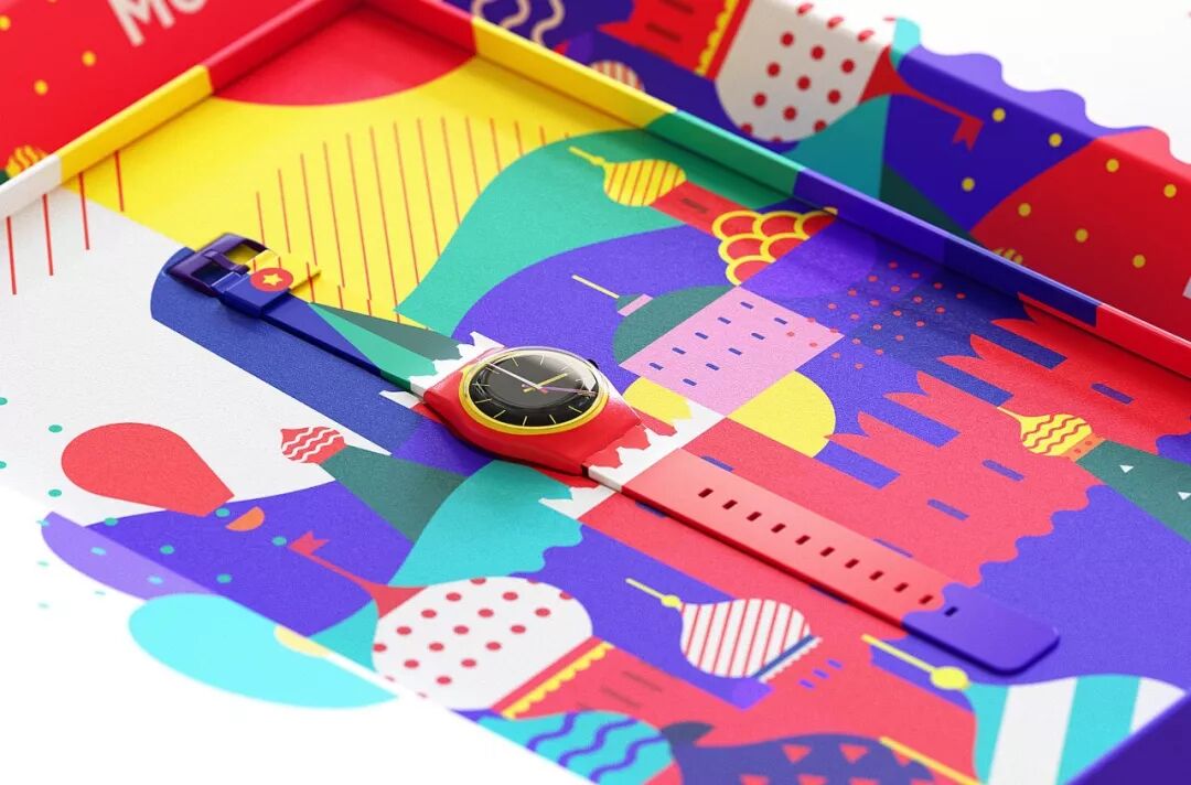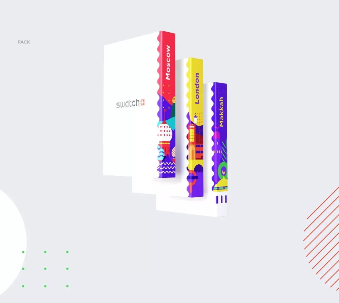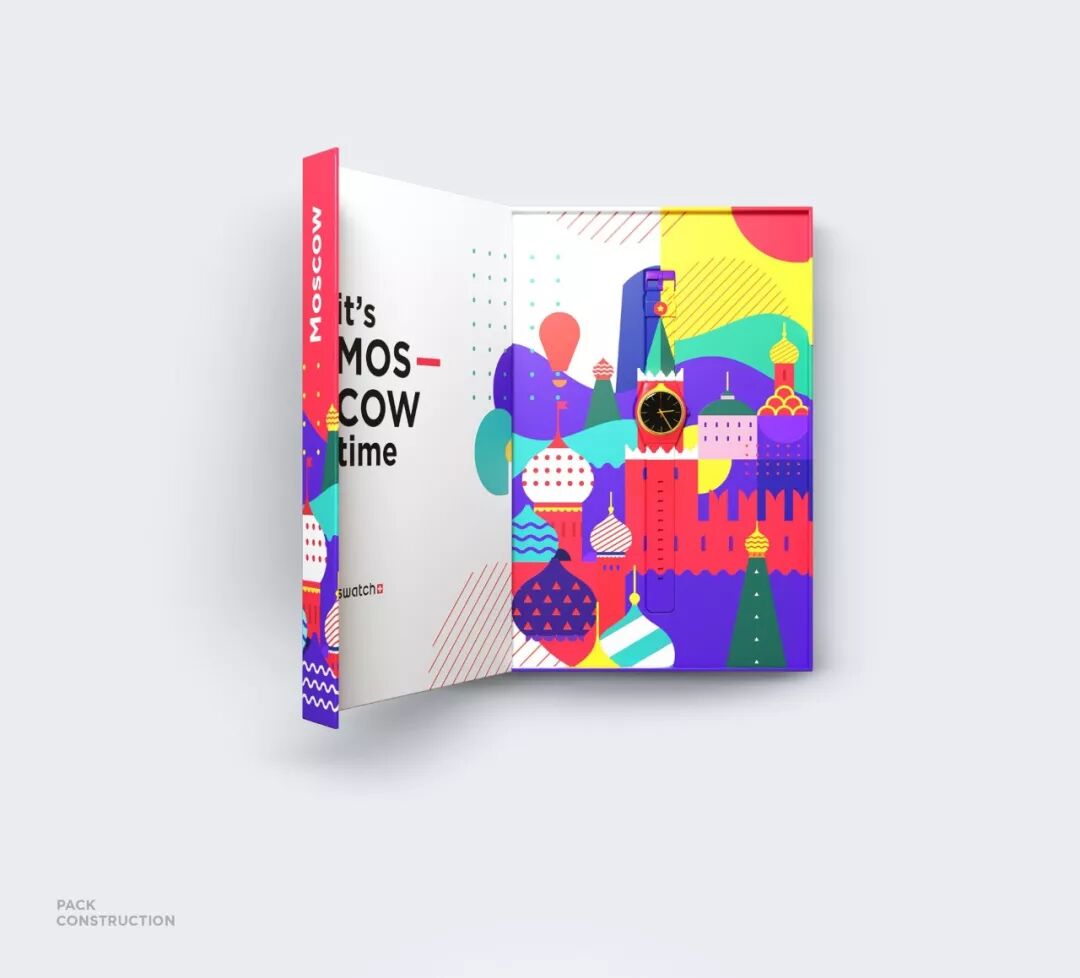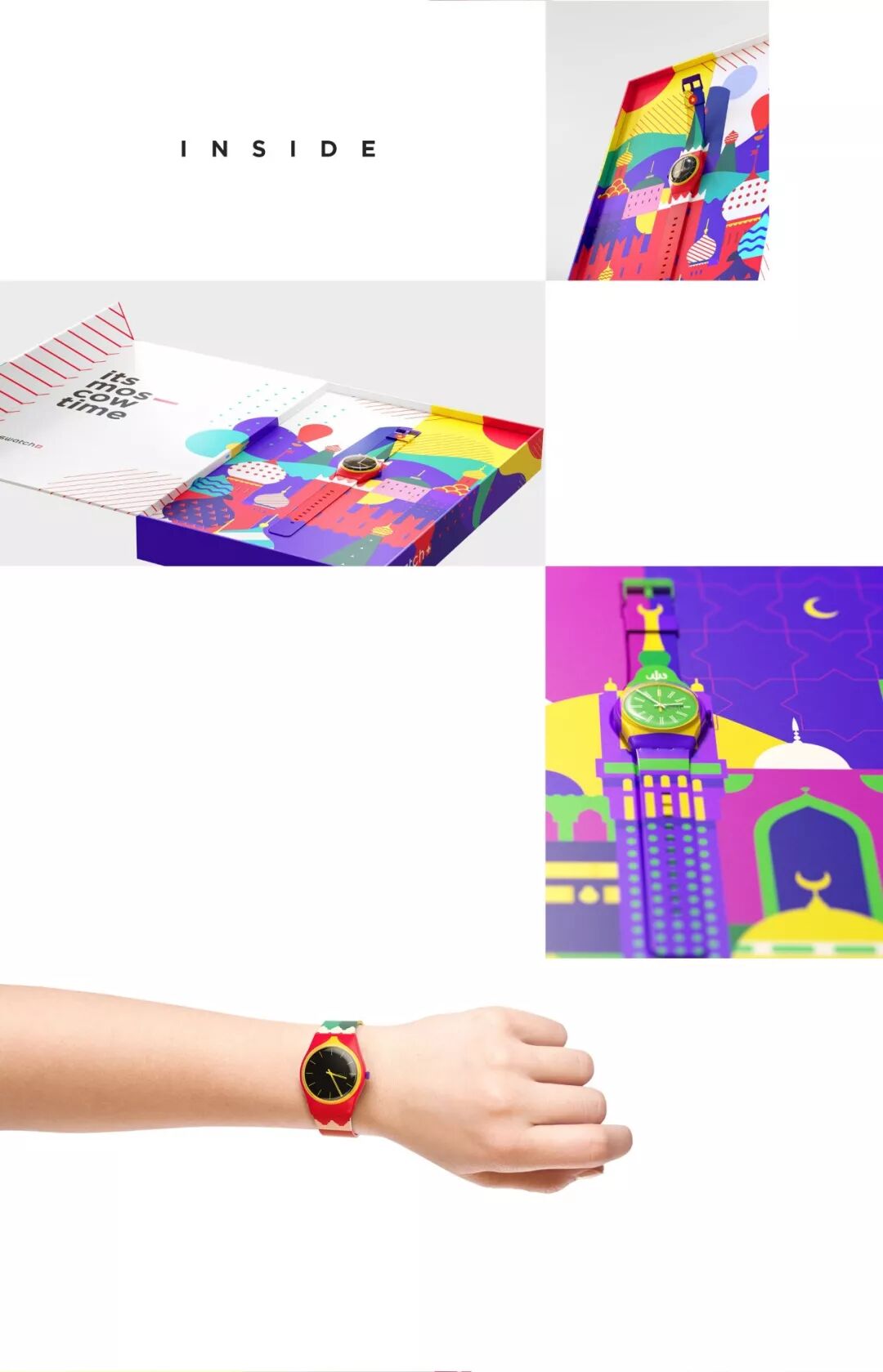 以知名手表品牌 Swatch 为蓝本,塑造了城市主题的三款手表,展现了三个城市的标志性建筑。在包装设计上更是迎合了手表的图案,融合成色彩缤纷的城市景色。