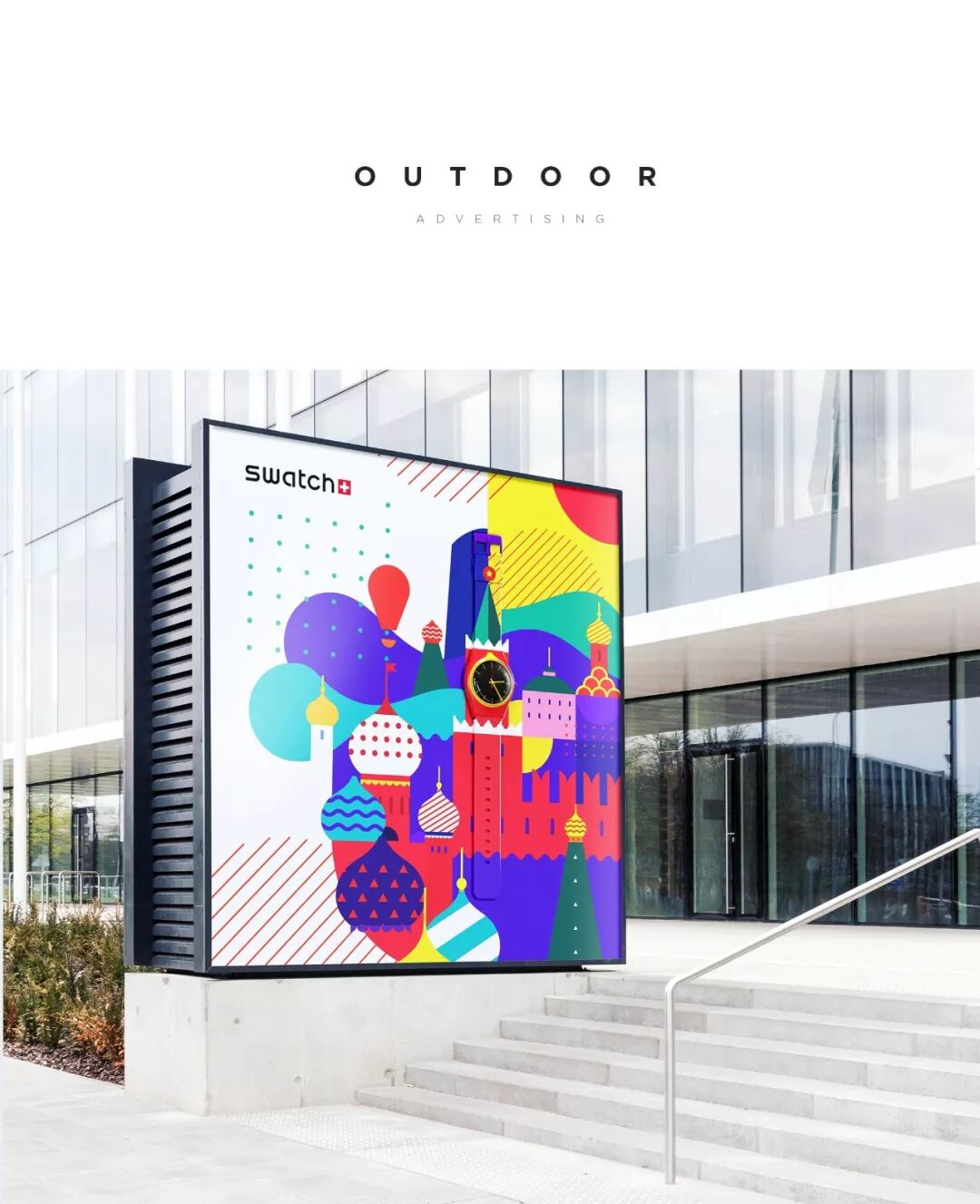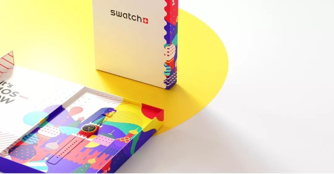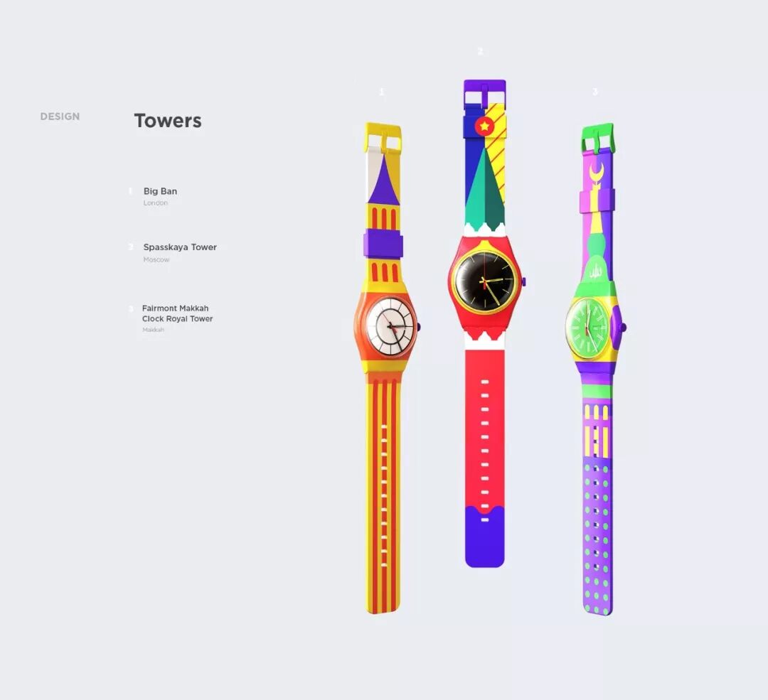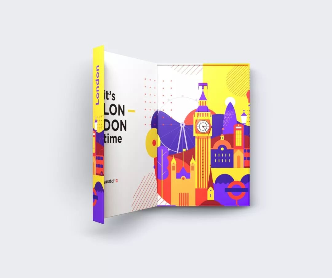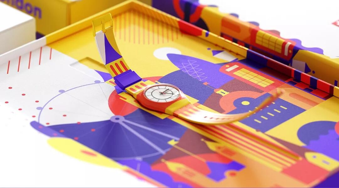 以知名手表品牌 Swatch 为蓝本,塑造了城市主题的三款手表,展现了三个城市的标志性建筑。在包装设计上更是迎合了手表的图案,融合成色彩缤纷的城市景色。