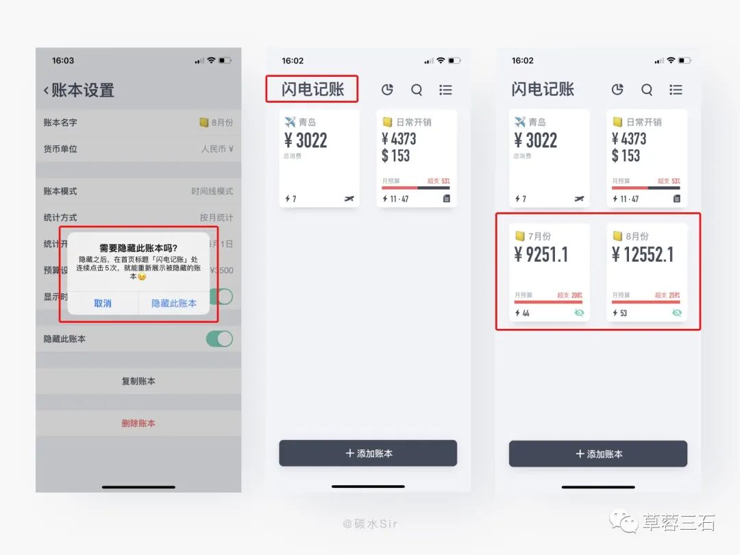 设计方案:在账本设计中,有一栏隐藏此账本功能,开启后,首页对应账本会消失,通过点击5次左上角闪电记账标志,就能重新展示被隐藏的账本。5次点击的高学习成本操作目的,是为了防止误操作发生同时增加隐藏账本的安全性。