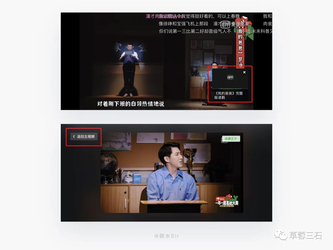 设计方案:在「一年一度喜剧大赛」中,会有很多喜剧故事,其中不免会有平平无奇的故事。通过剪辑把优质内容放在热期剧里,一般内容通过完整剪辑放置二级页面。用户在热期剧中会看到节选片段,对于感兴趣的内容通过点击右下方小窗口进入观看。这种做法,很好的整合优质内容,让综艺节目更加好看,同时也预留了其他故事情节的入口,满足小部分用户。