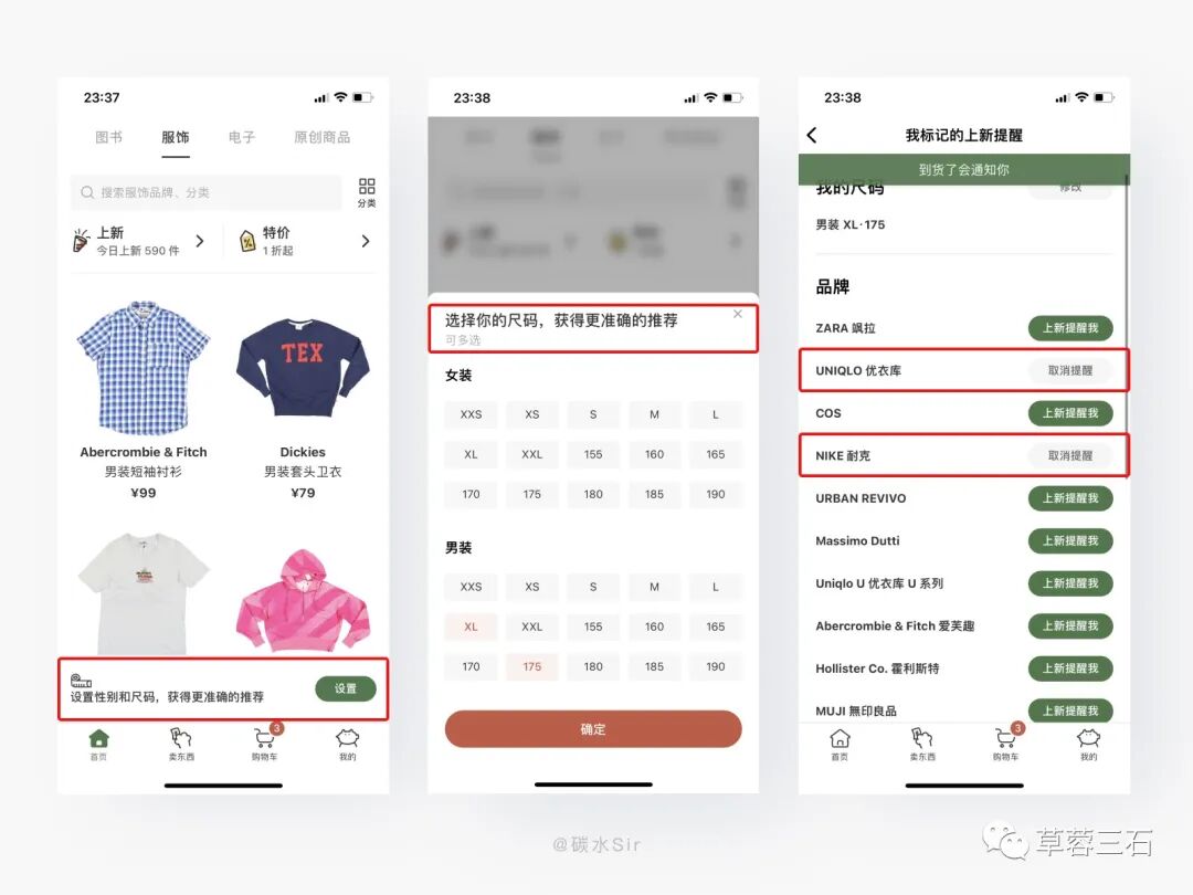 设计方案:在第一次进入服饰页面时,提供设置性别和尺码的推荐机制。选择设置,提供更精准的服饰分类和品牌的选择,当设置过后,出现该服饰,会第一时间给特定人群