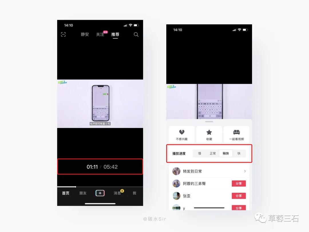 设计方案:在视频浏览时,长按屏幕,会浮出更多操作,当视频大于15s时提供「播放速度」功能,根据用户习惯选择倍速播放,当错过重点内容或二次查看时,可拖动底部滑杆调节时间位置,提高浏览效率。如今在观看电视剧综艺等长视频时,习惯了倍速播放的用户忍受不了普通倍速,「抖音」洞察到这一点,把倍速功能移到短视频中。因为短视频就是依靠不断刷剧,5s小梗10s大梗带给用户短时间爽的体验,从而达到用户粘性持续保持的效果。