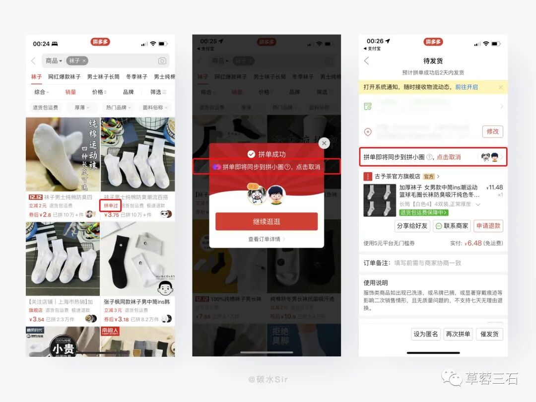 拼多多独特的拼单购买流程,以及购买后的「拼单成功」弹窗,每当出现同步到拼小圈时心里总会咯噔一下,自己买的东西为什么要让别人看到。