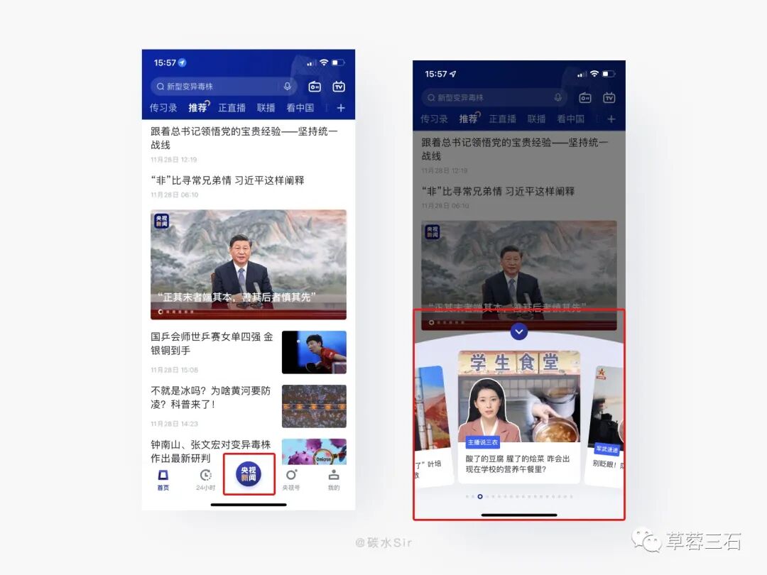 设计方案:在底部驼式标签栏中,央视新闻按钮内整合各新闻视频于一体,以驼式转盘为表现手法,让用户易于理解交互手势,减少学习成本。并且点击进入对应栏目视频,之后刷到的都是相同栏目不同的内容,有效提高同栏目多内容曝光度。同时专注阅读的用户和看视频的用户形式互不干扰。