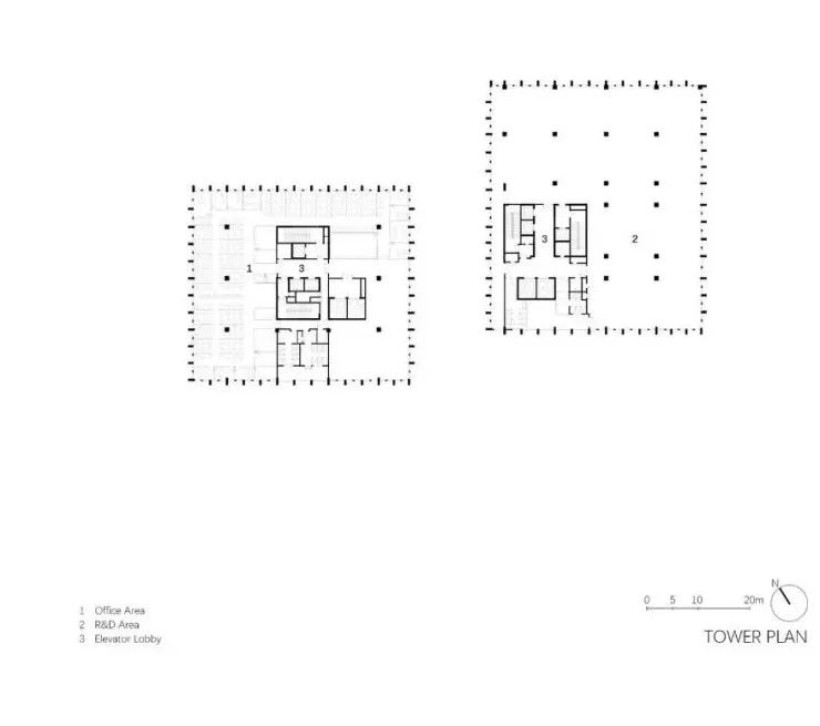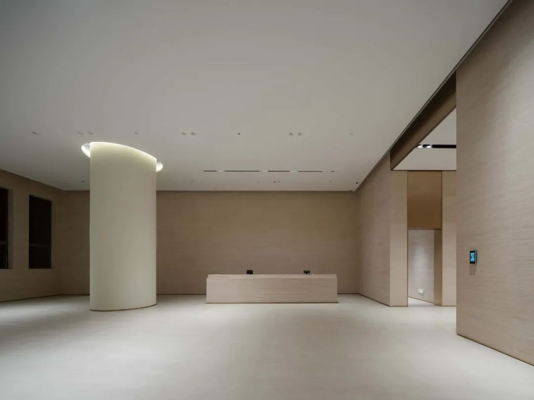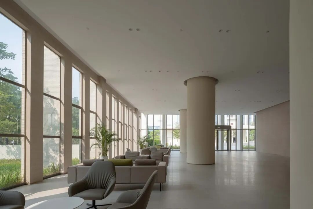 首层平阔的广场犹如基座般锚定了分散的单体,赋予园区连贯与端正的气质。贯通裙楼与展厅之间的“游廊”即是立面的一部分,也是广场的延伸。它在人与工业尺度之间找到了缓冲与平衡,模糊了室内外界面。下沉的树阵广场铺排出三级高差,结合喷泉与水景营造静态广场内院。一同与轴线上的展厅单体和大堂形成视觉通廊。